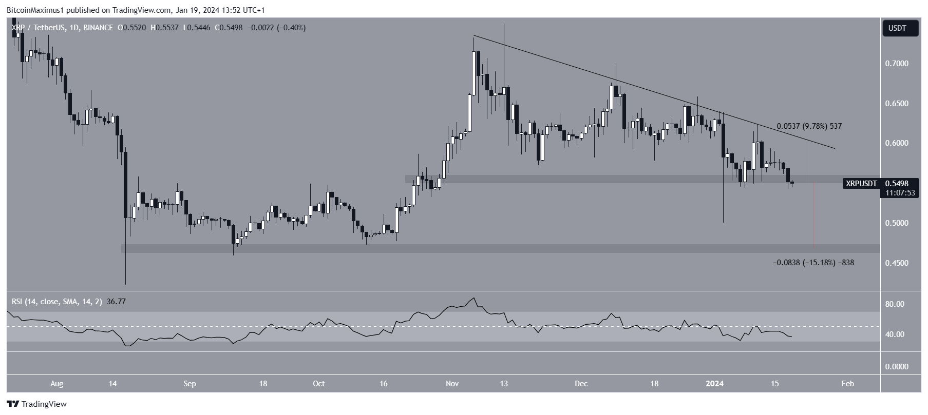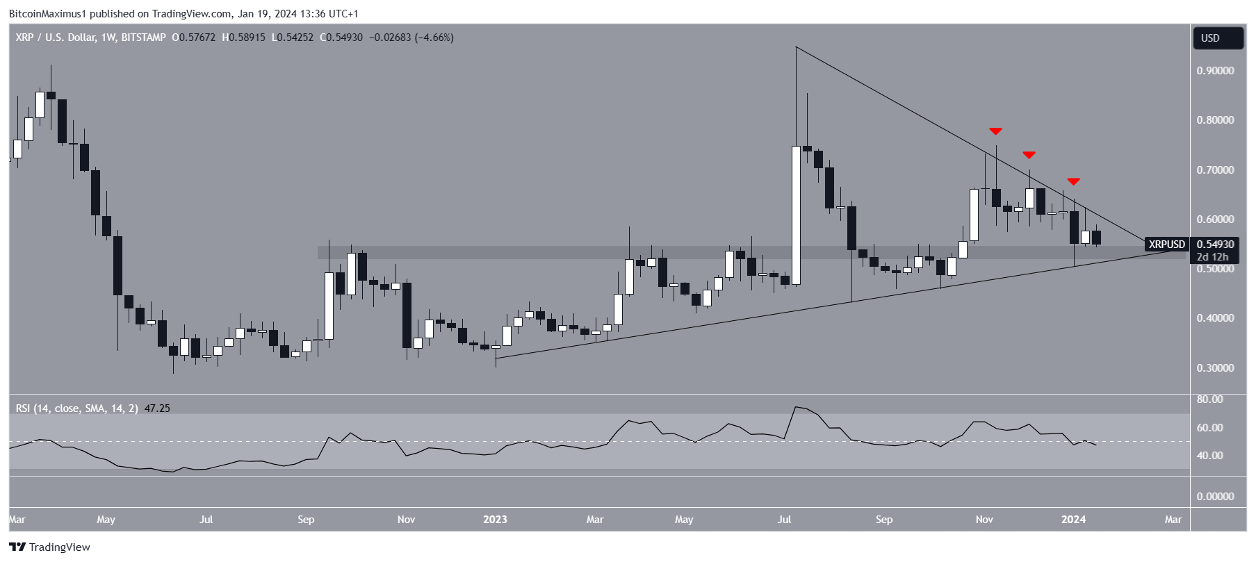 SponsoredThe price action shows a short-term symmetrical triangle that has existed since November 2023. If so, XRP is breaking down from its support at $0.55.
