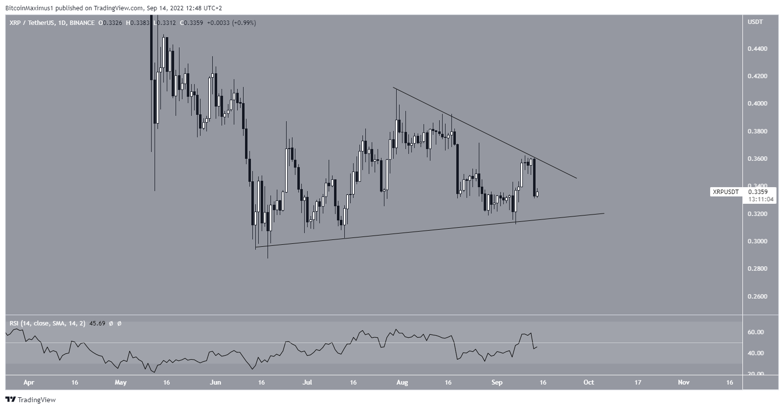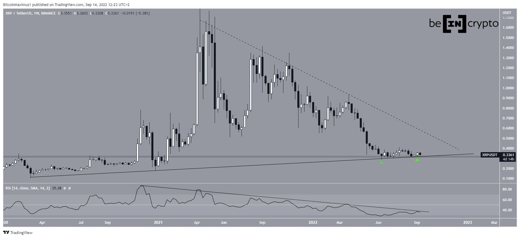 XRP has been falling underneath a descending resistance line (dashed) since reaching a high of $1.97 in April 2021. The downward movement has led to a low of $0.287 in June 2022. The ensuing bounce (green icon) validated a long-term ascending support line.