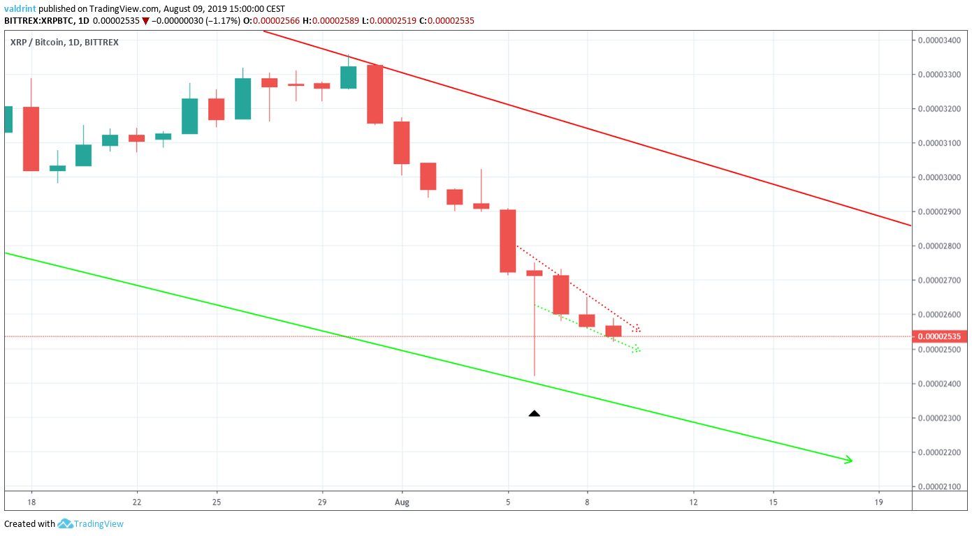 On August 4, 2019, the XRP price reached a high of 3053 satoshis. A downward move ensued, alternating between sharp and gradual decreases. XRP has made several successive lower lows.