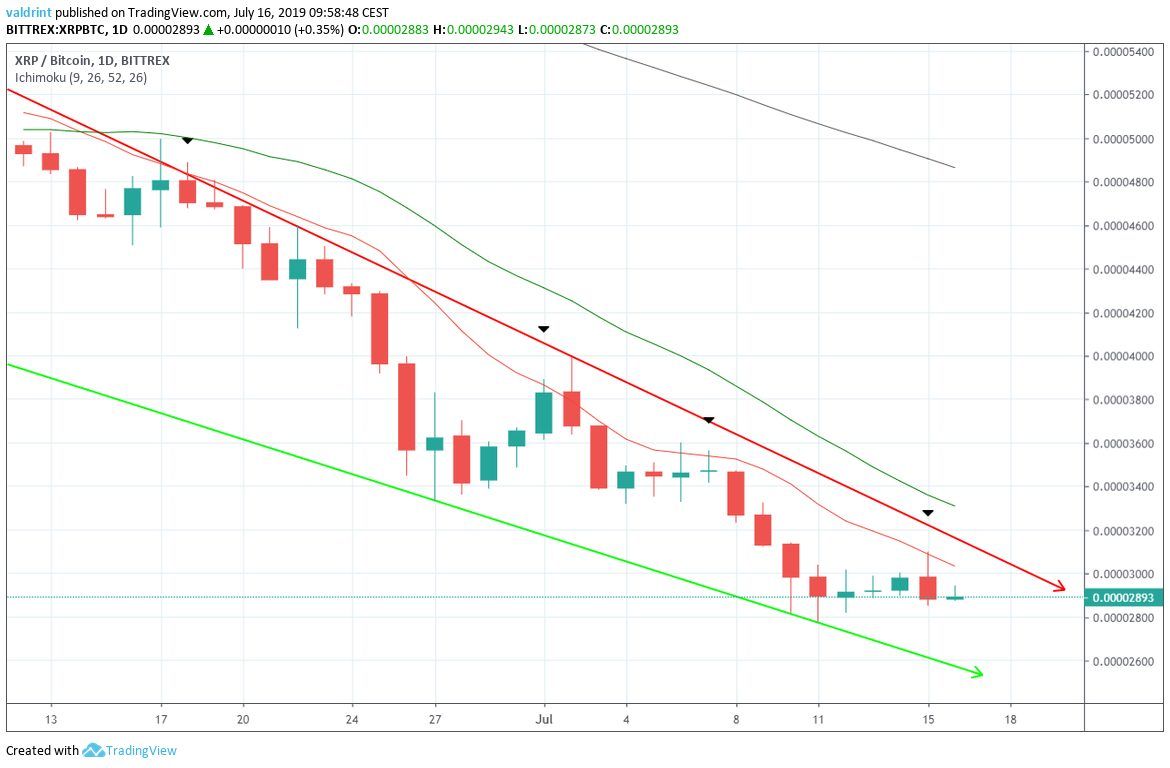 On July 6, 2019, the XRP price began an upward move and reached a high of 3600 satoshis. A decrease followed, which is still continuing. On July 11, XRP made a low of 2777 satoshis.