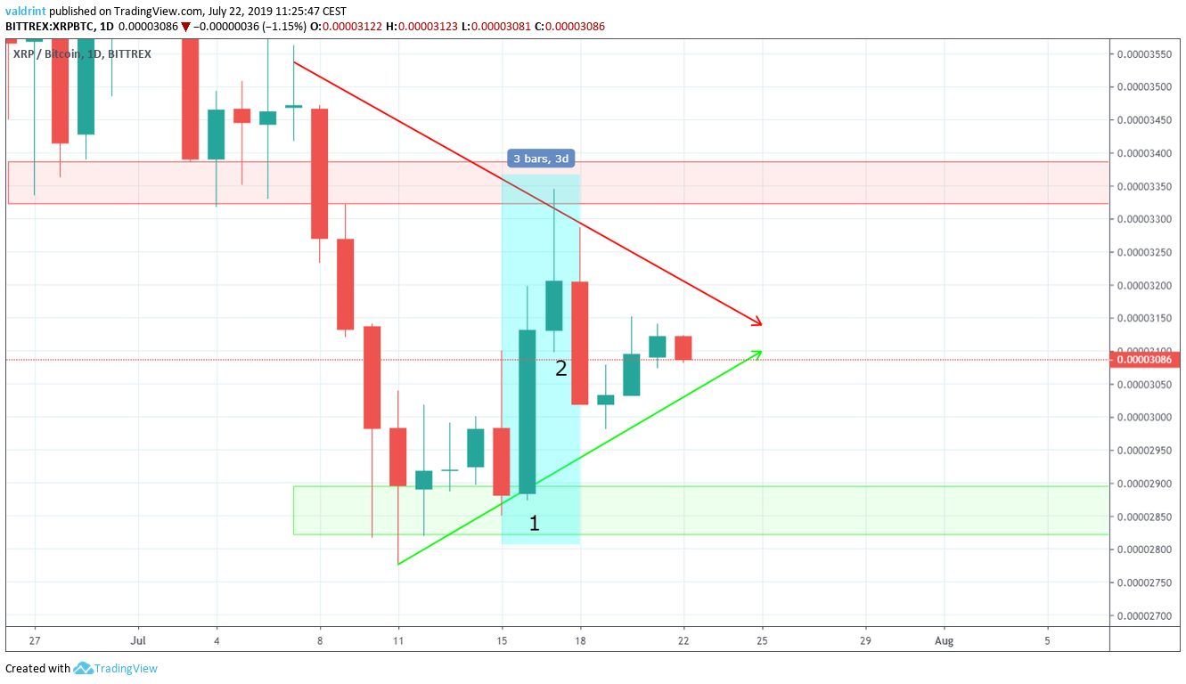 The area is found near 3350 satoshis. It acted as support in the period from June 28 to July 8, before the XRP price broke down.