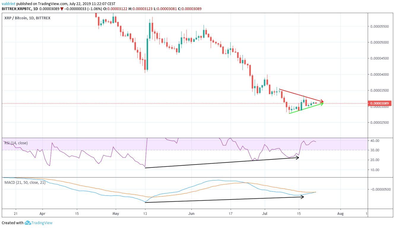 A long-term view shows that the XRP price is trading very close to a significant support area, which is found at 2850 satoshis.