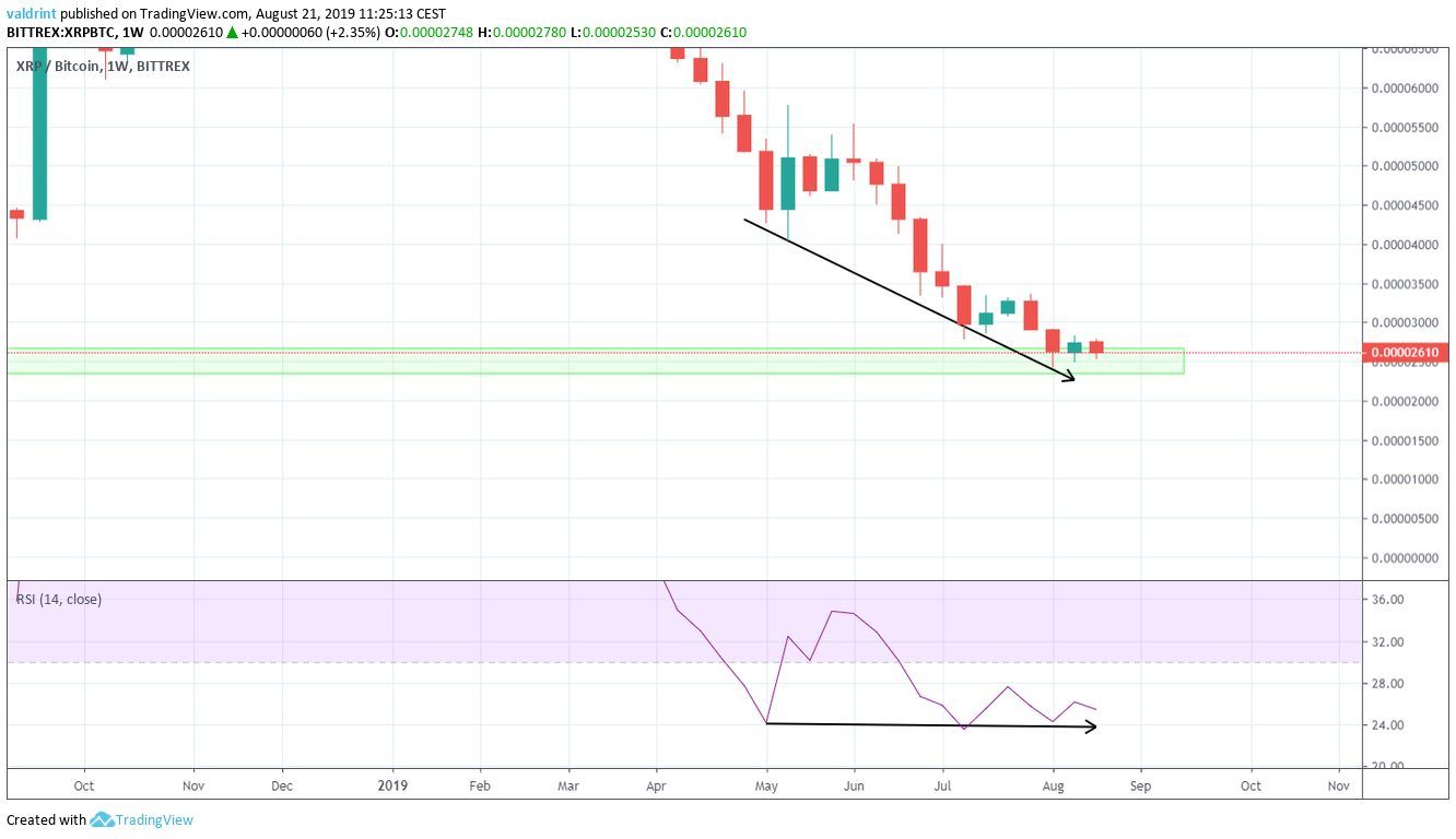 Divergence in the RSI in a weekly time-frame is uncommon and makes us believe that the XRP price will eventually begin an upward move.