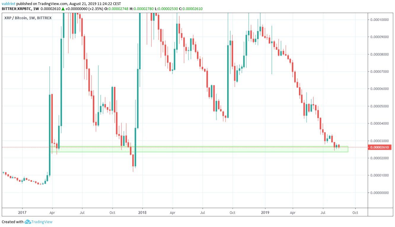 Due to the price being at a very significant support area, XRP/BTC looks like a potential buy and hold for a possible future upward move.