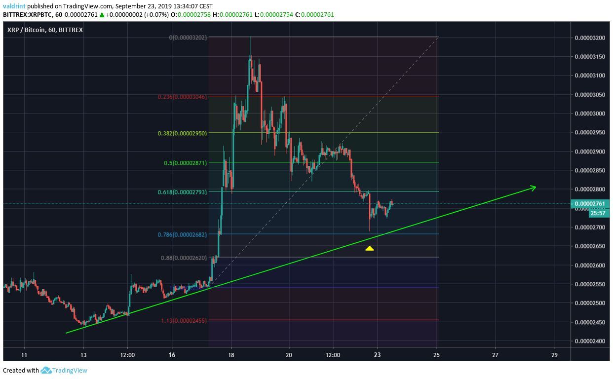 Additionally, it looks as if the XRP price has attempted to initiate a reversal at the 0.786 fib level of the entire upward move near 2700 satoshis.