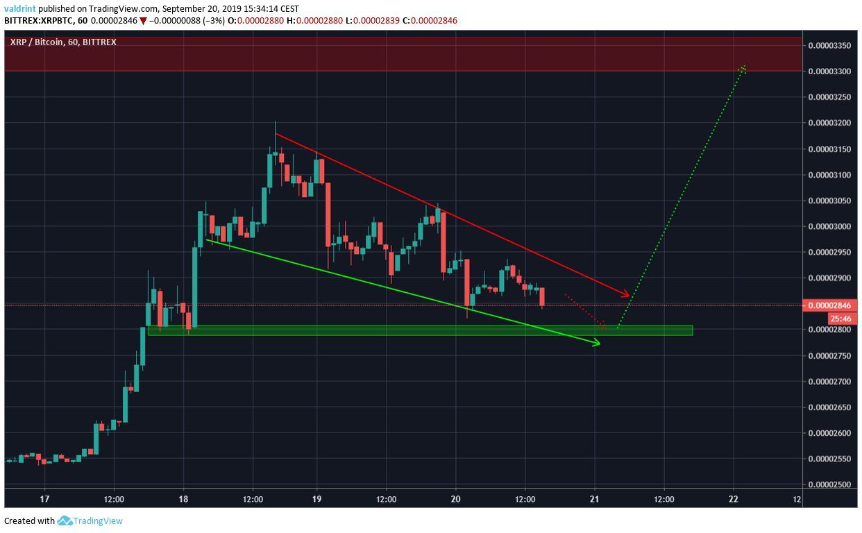 Looking closer at the hourly chart we can see that XRP has been trading inside a descending wedge since reaching the aforementioned high on September 18.