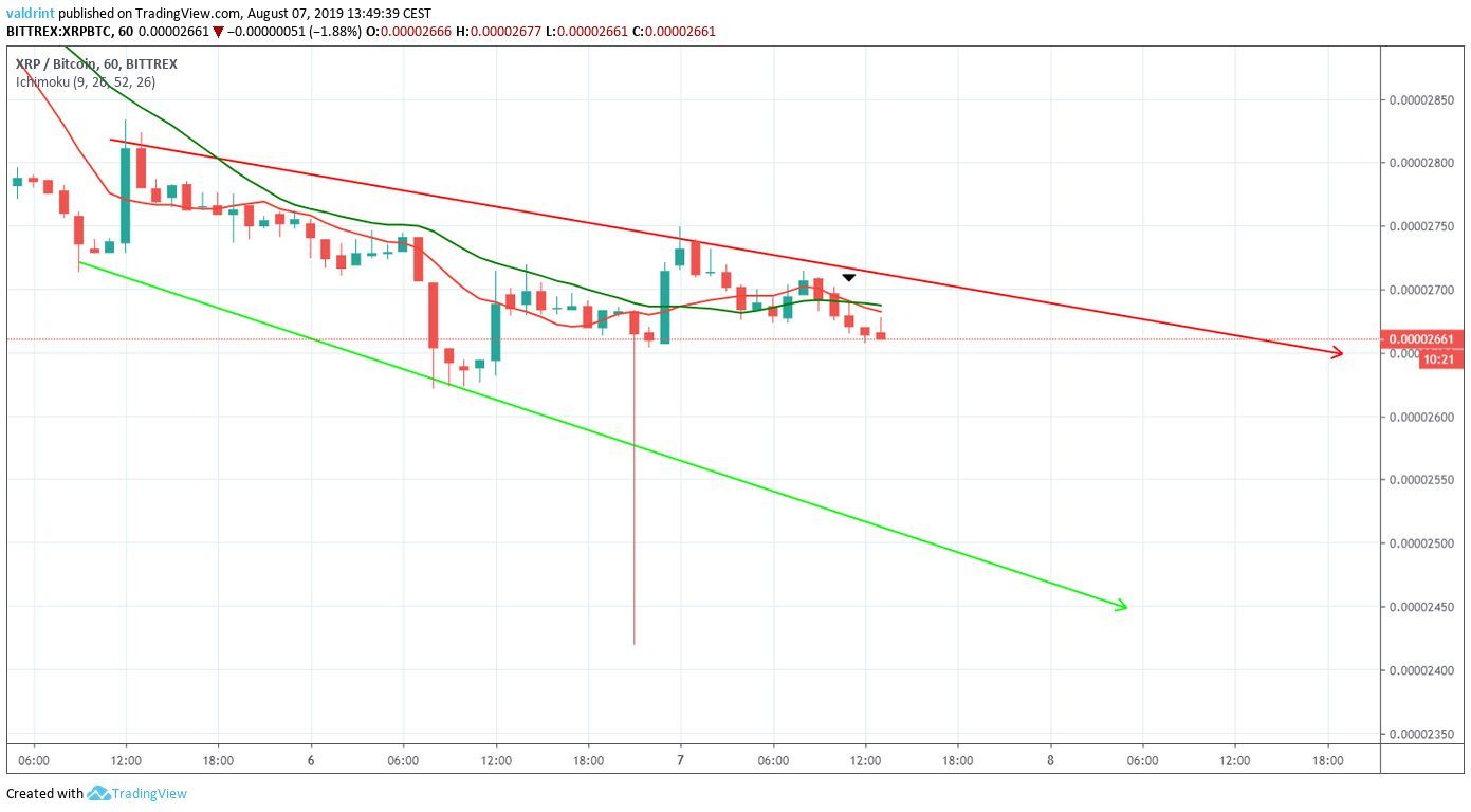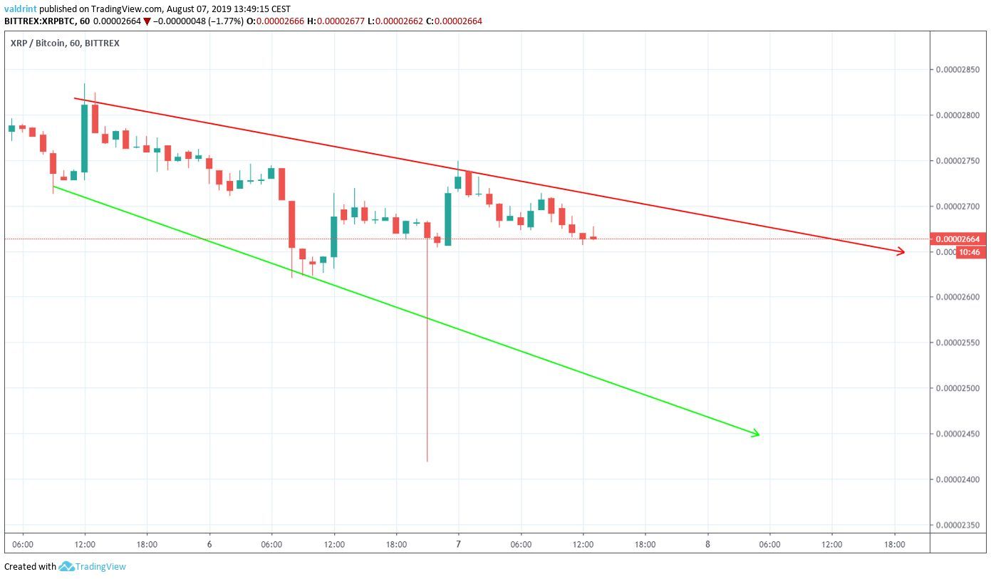 On July 11, the XRP price reached a low of 2777 satoshis. An upward move followed, which lasted until July 30 with a high of 3566. XRP has been decreasing since. On August 6, it reached a low of 2419 satoshis.