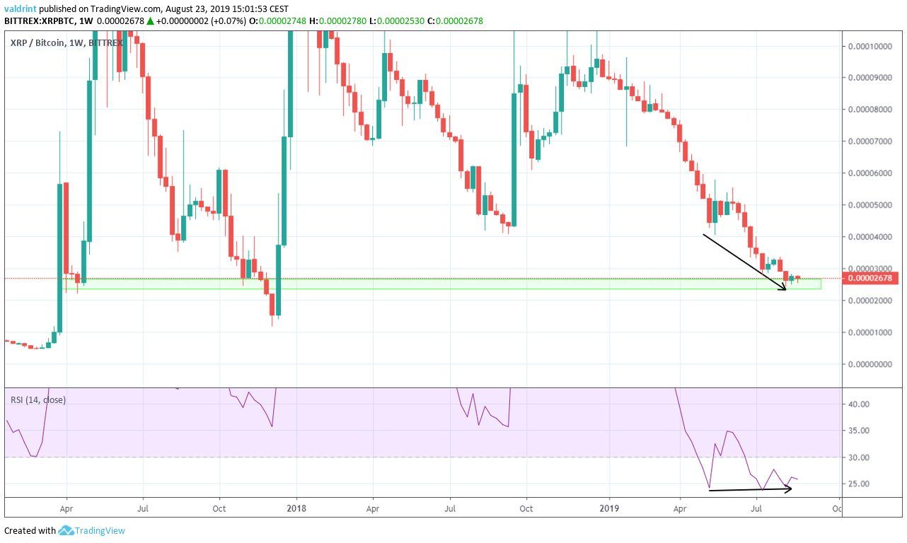 On August 9, 2019, the XRP price reached a low of 2465 satoshis. An upward move ensued, and on August 14 XRP reached a high of 2822 satoshis. After a rapid decrease, it reached similar highs on August 18. It has been decreasing since.