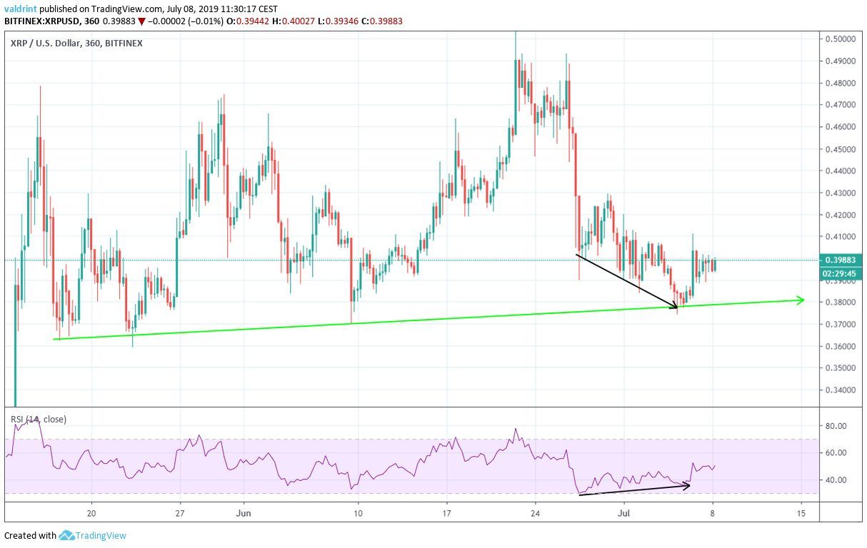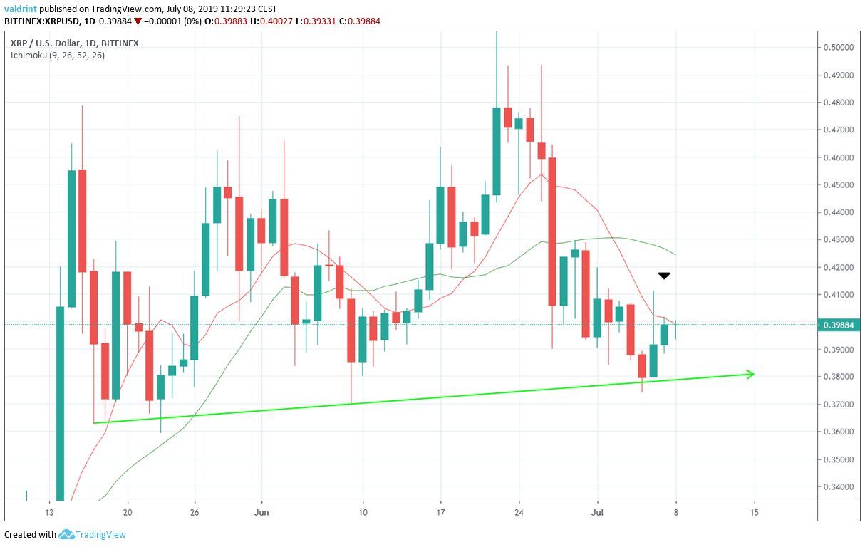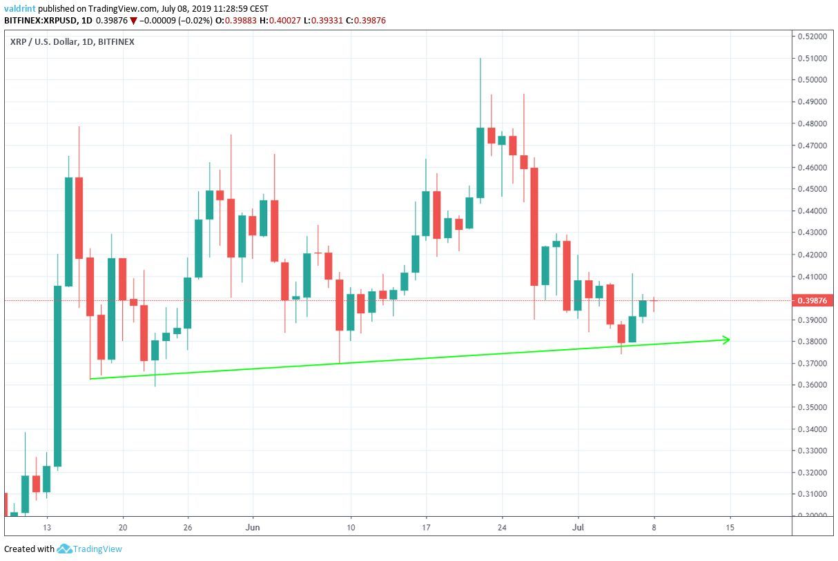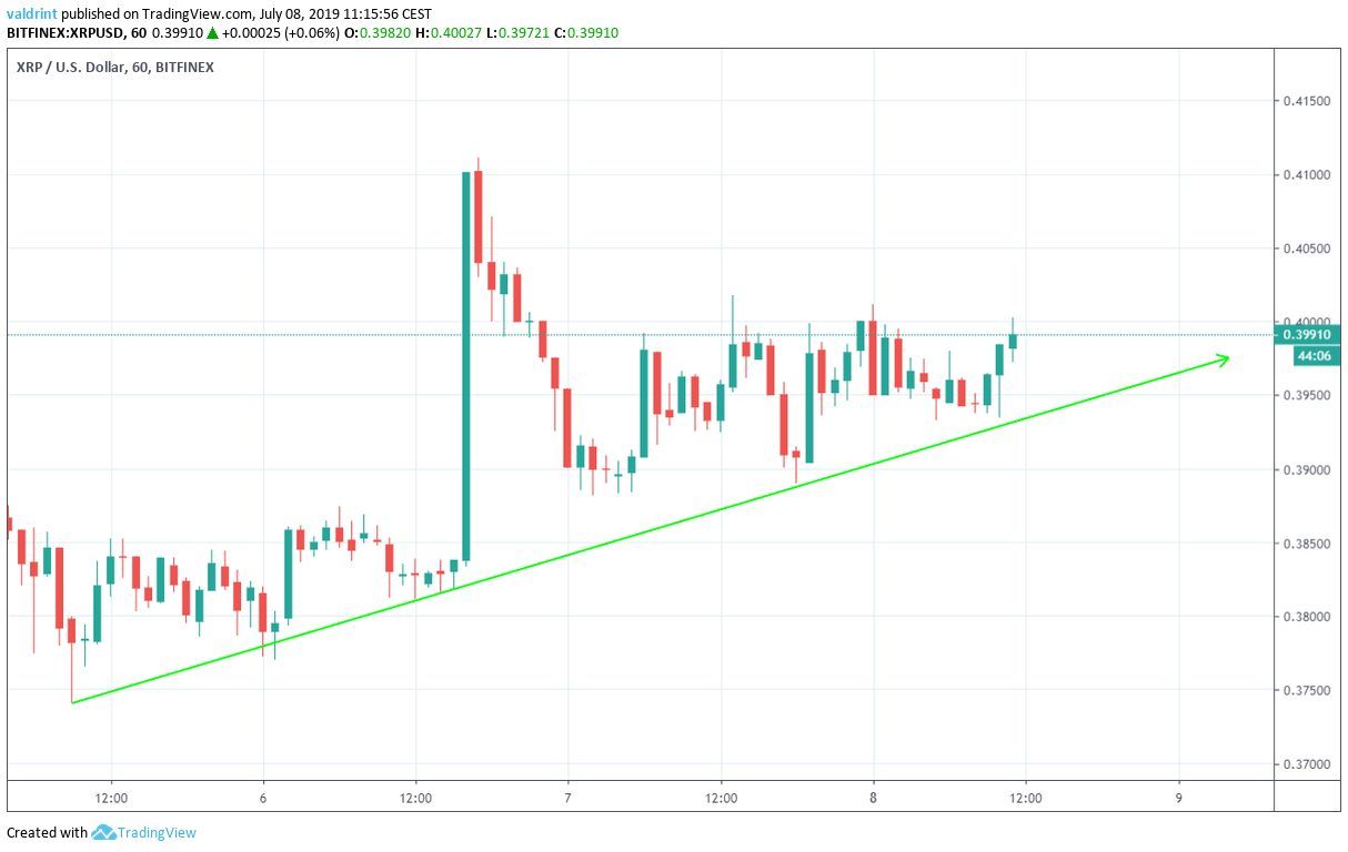 On July 27, 2019, the XRP price reached a high of $0.49. A rapid decrease ensued. On July 5, the price made a low of $0.375. It has been increasing since.