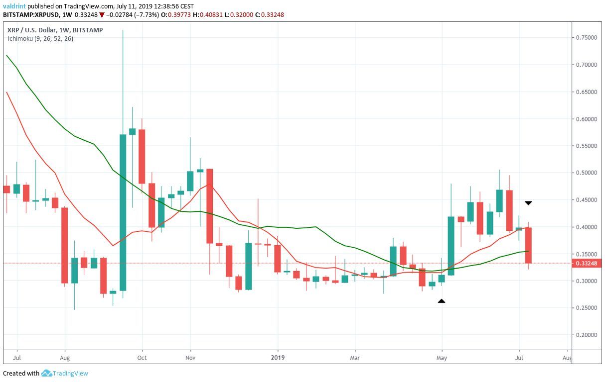 On June 22, 2019, the XRP price briefly reached highs above $0.5. After a gradual decrease, similar highs were reached on June 26. Since then, the price has been decreasing.