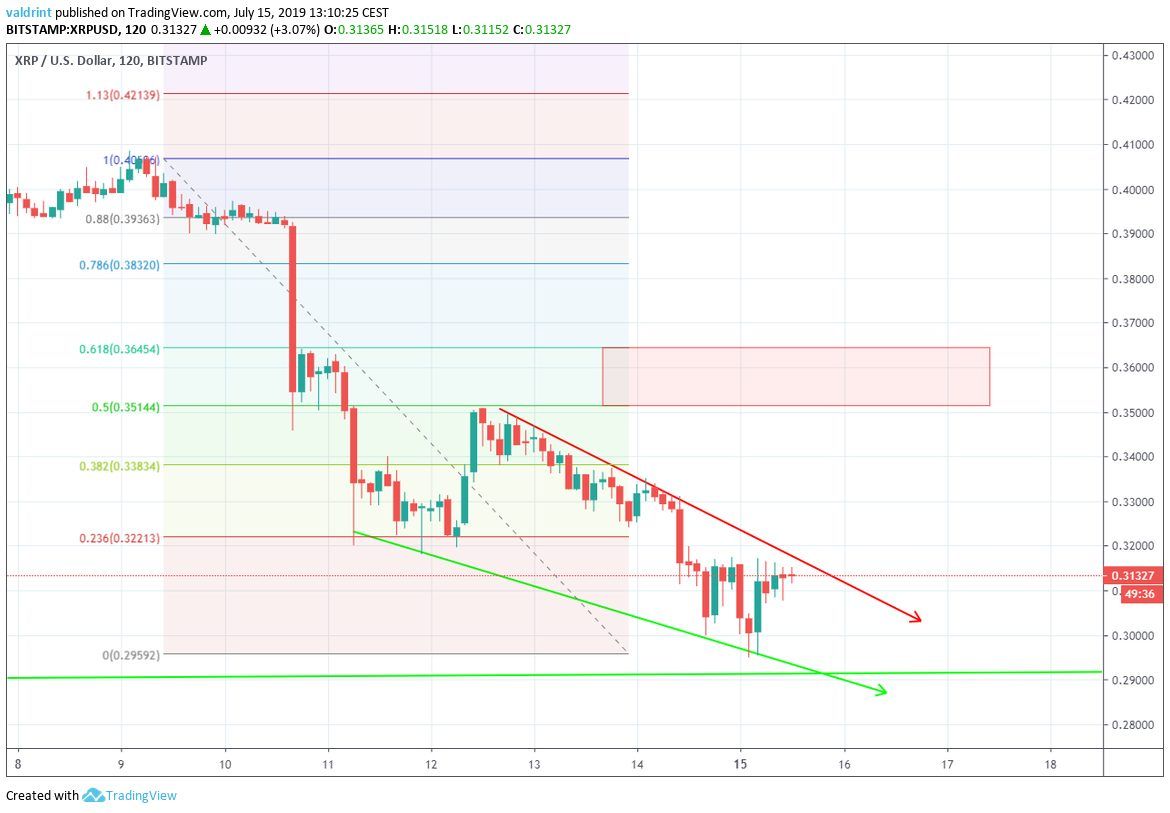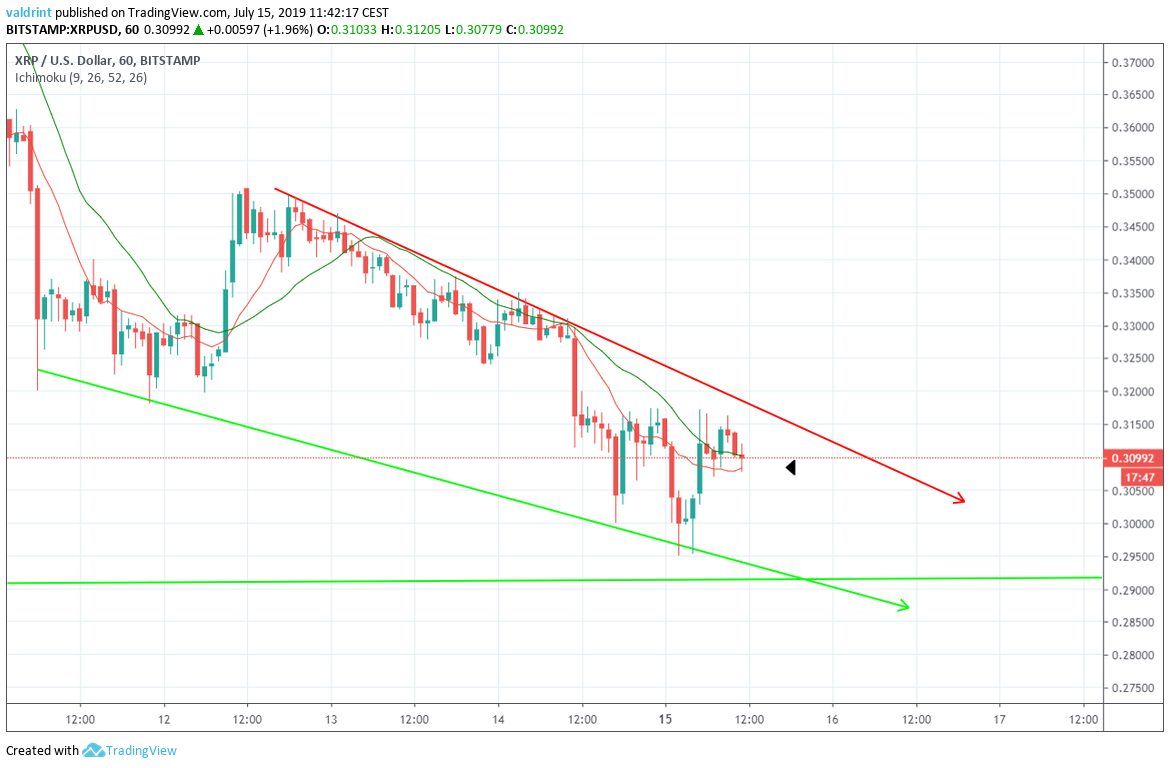 The $0.35 level was reached on July 12, before the XRP price began a downward move and created the resistance line of the wedge.