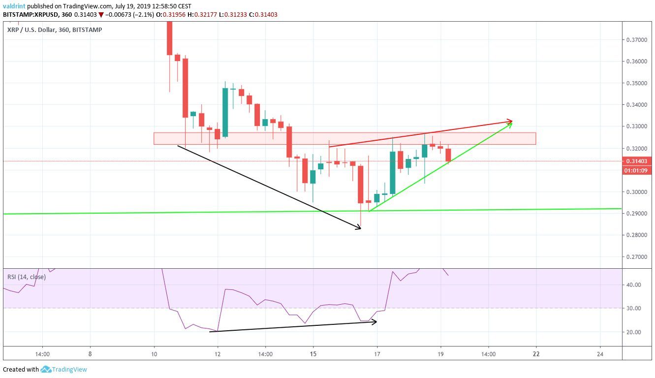 On July 12, 2019, the XRP price reached a high of $0.35. A decrease ensued. On July 16, the price made a low of $0.284. It has been increasing since.