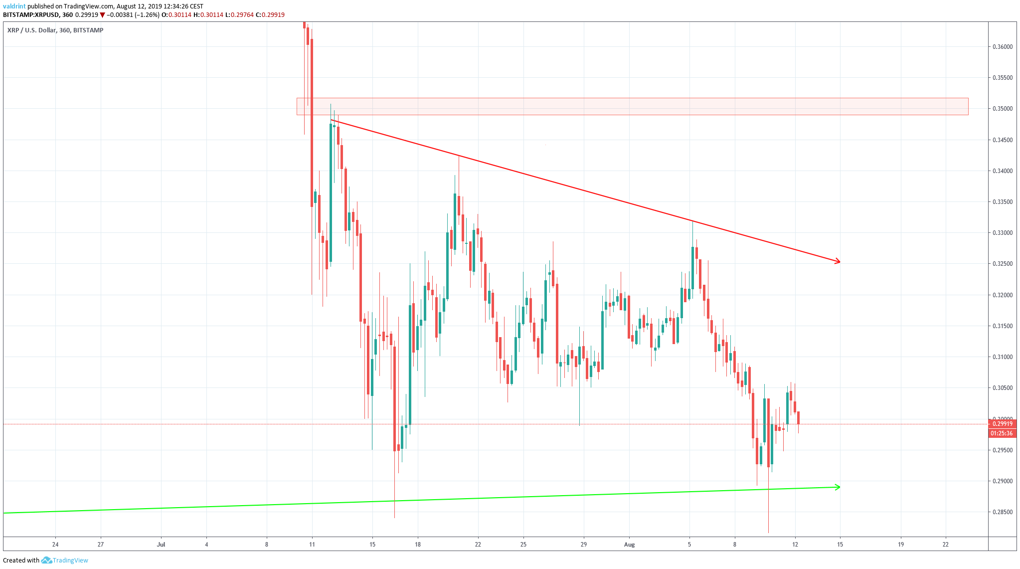 A look at the two-hour time-frame shows that XRP has been following a descending resistance line since July 12.