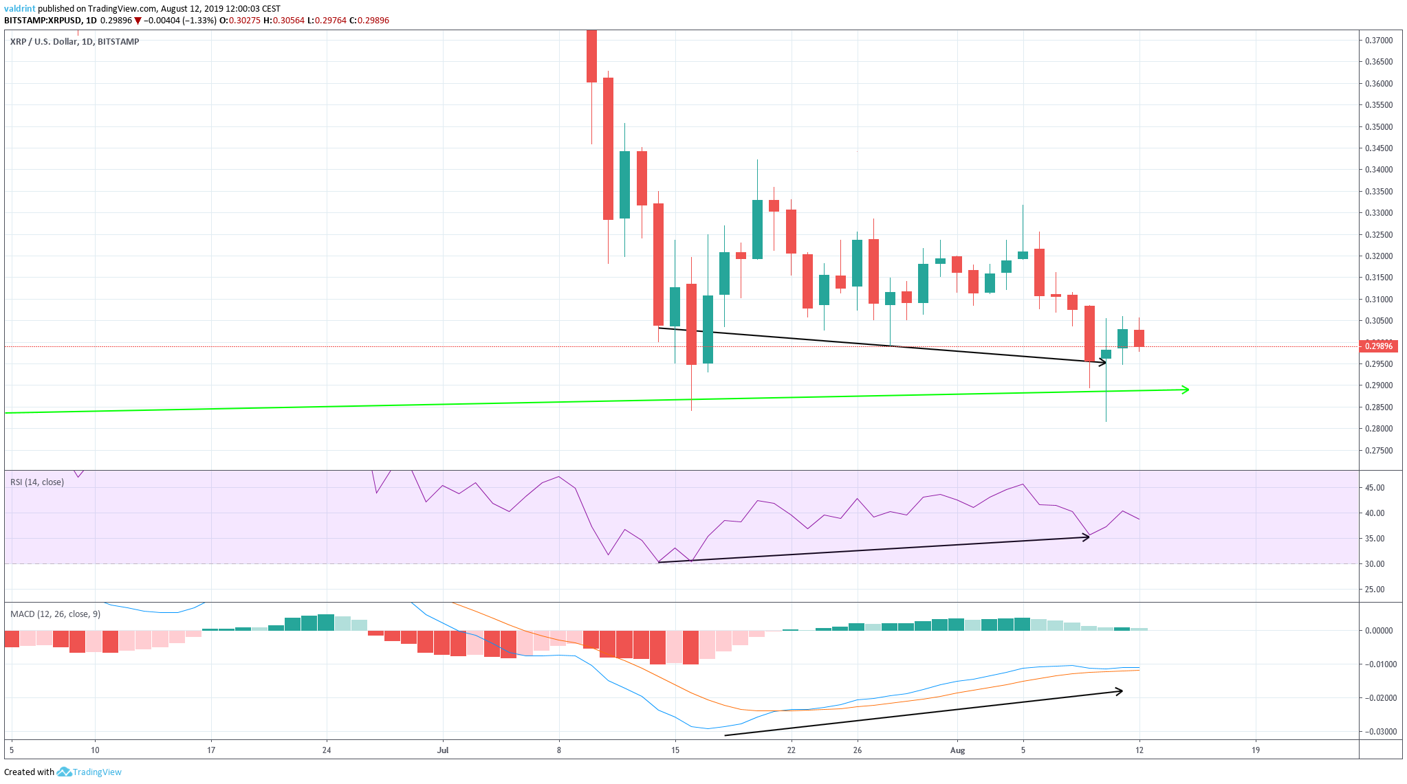 On July 16, 2019, the XRP price reached a low of $0.28. An upward move ensued. XRP reached a high of $0.34 on July 20. It has been decreasing since then. On August 10, it reached a low of $0.281.