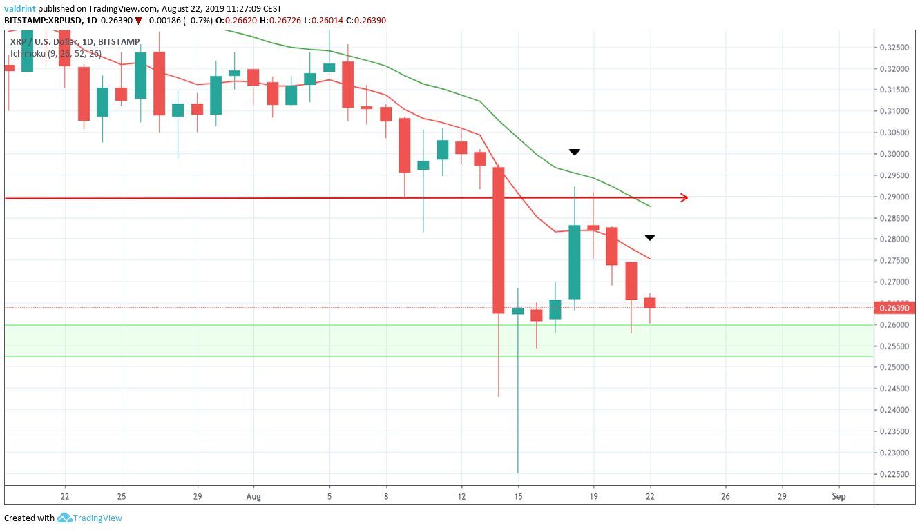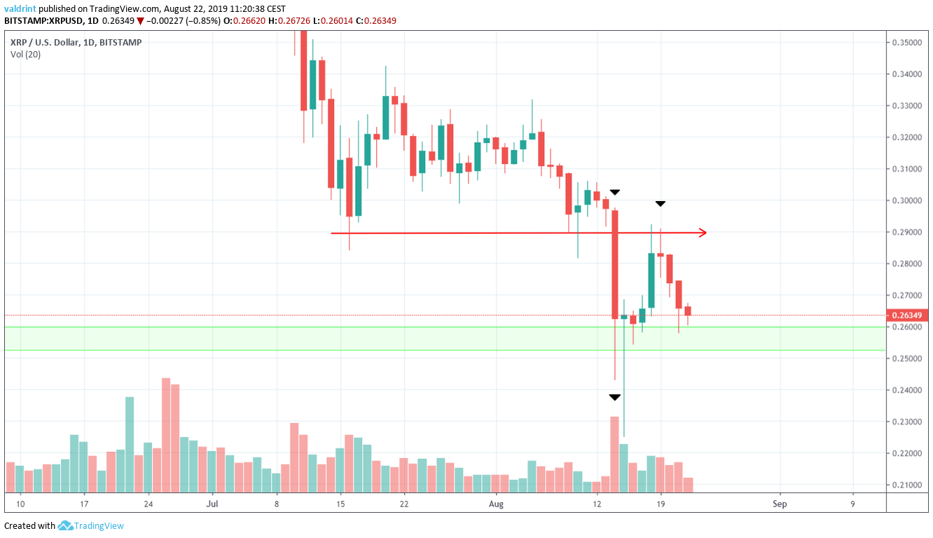 On August 14, the XRP price reached a high of $0.29. A rapid decrease ensued and the price reached a low of $0.24 the same day. This amounted to a decrease of more than 16 percent in two-hours. On August 19, it reached a similar high near $0.29 before beginning yet another decrease.