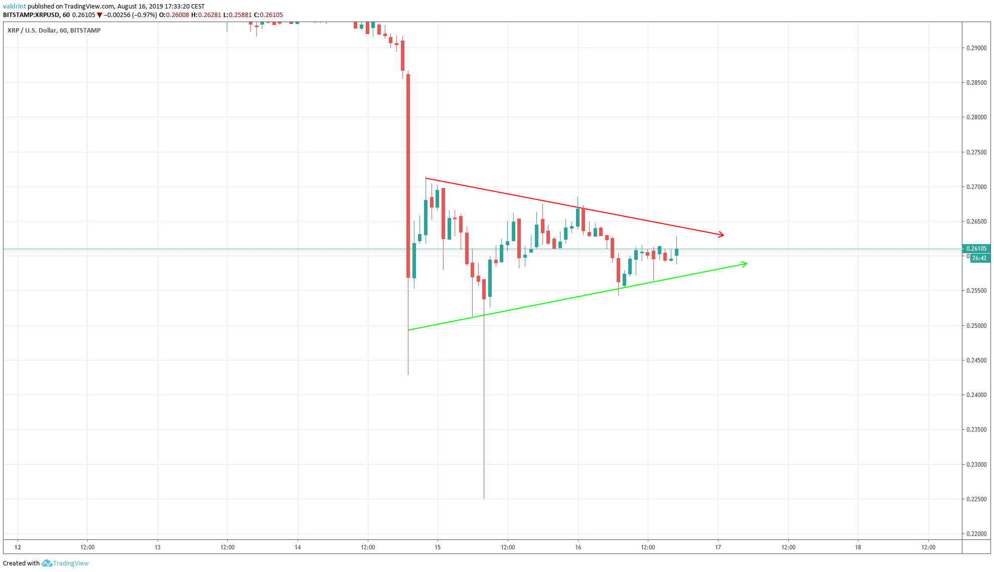 A closer look at price movement reveals that since July 16 the XRP price traded inside a descending triangle until it broke down on August 14.