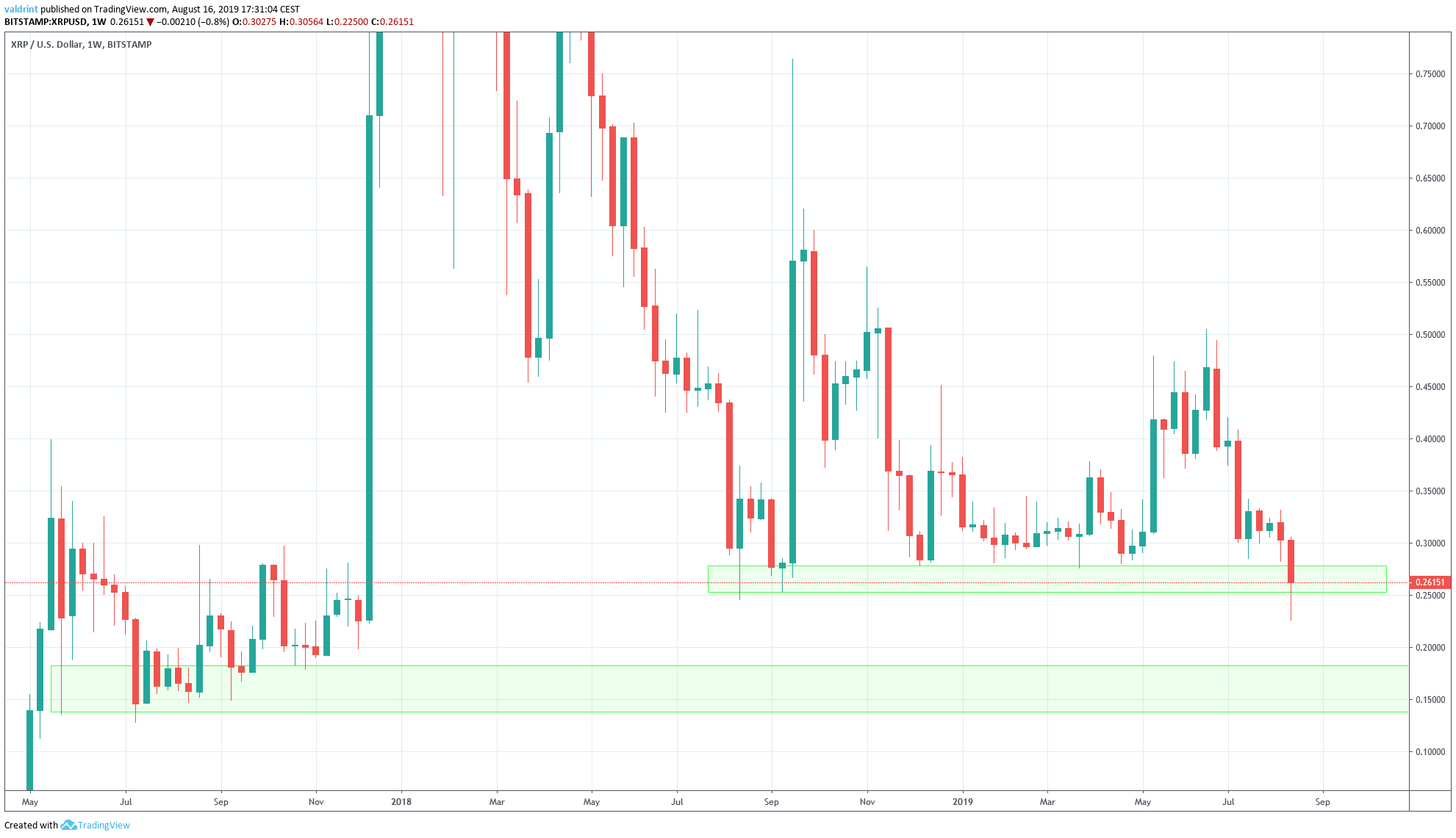 A look at the weekly chart shows that the XRP price is trading inside a critical support area.