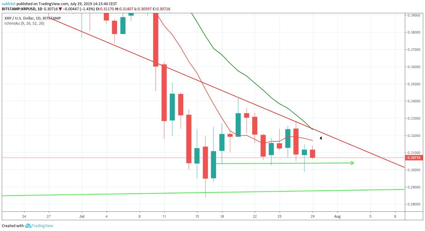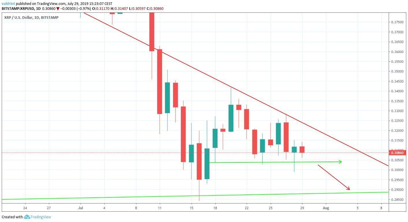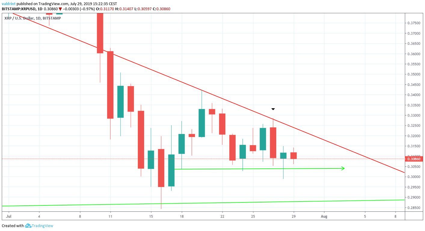 Combined with a horizontal support line at $0.30 that has been in place since July 19, XRP creates a descending triangle.