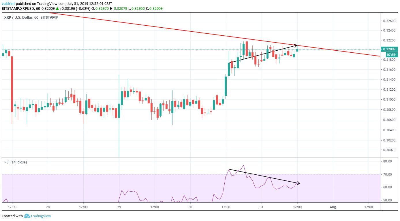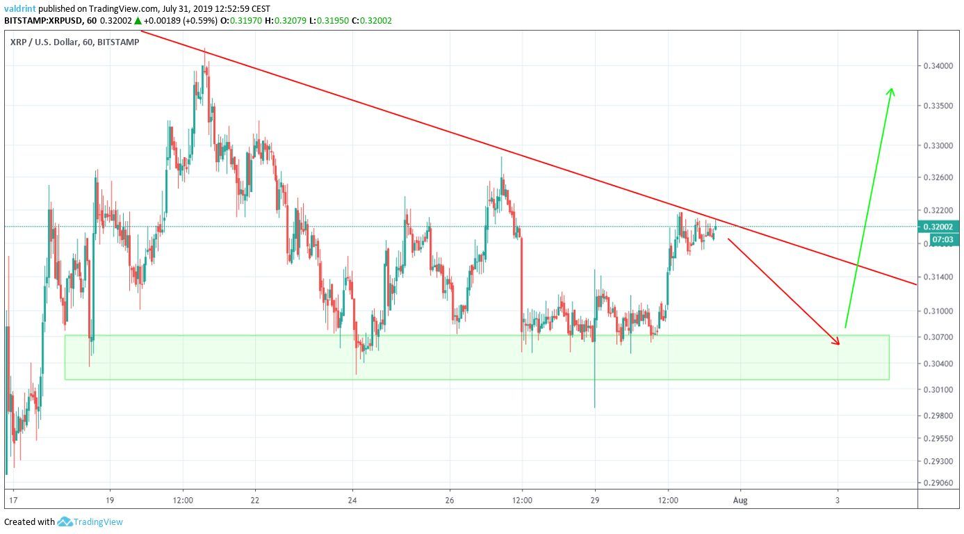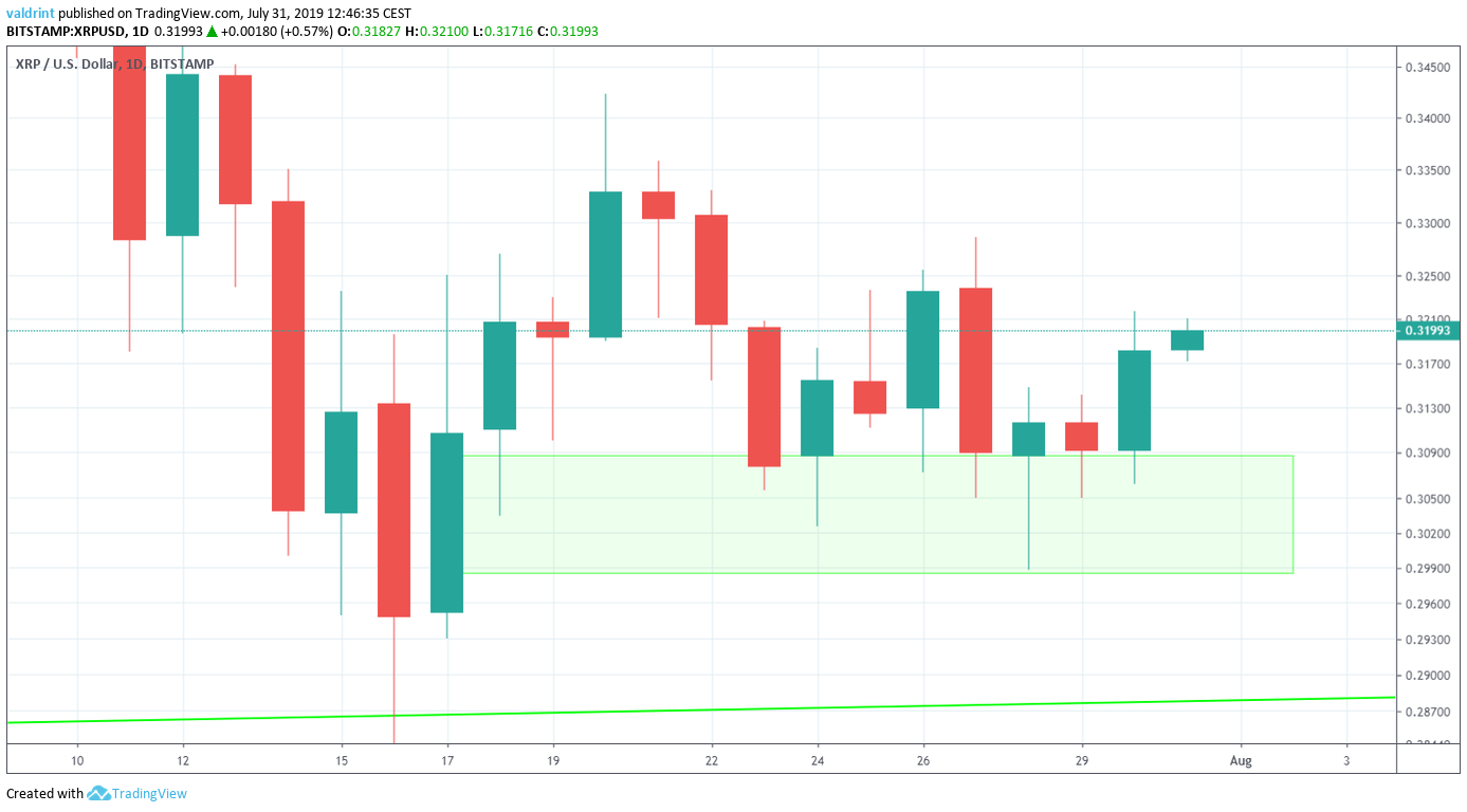 On July 17, 2019, the XRP (XRP) price reached a low of $0.285. An upward move ensued. The price reached highs above $0.34 on July 20. Since then, it has been decreasing, trading inside a range between $0.30 and $0.33.