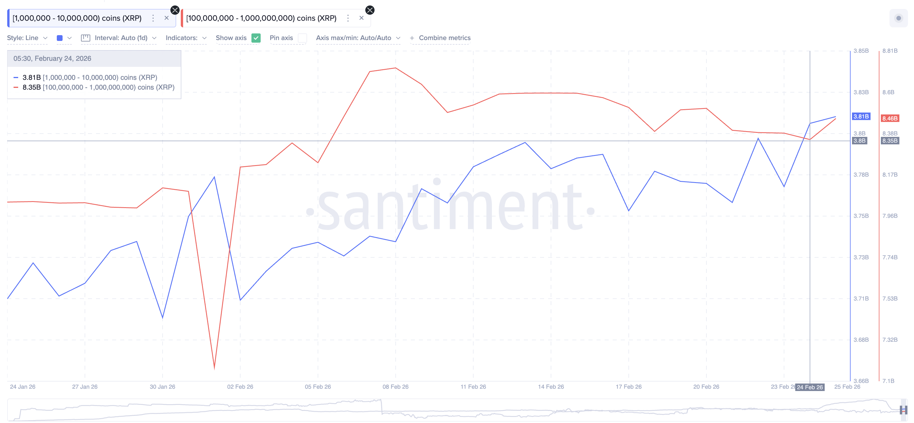 Whale behavior during this period adds another critical piece. Wallets holding between 1 million and 10 million XRP increased their holdings from 3.77 billion XRP to 3.81 billion XRP. At the same time, the largest whale group, holding between 100 million and 1 billion XRP, increased holdings from 8.35 billion XRP to 8.46 billion XRP.