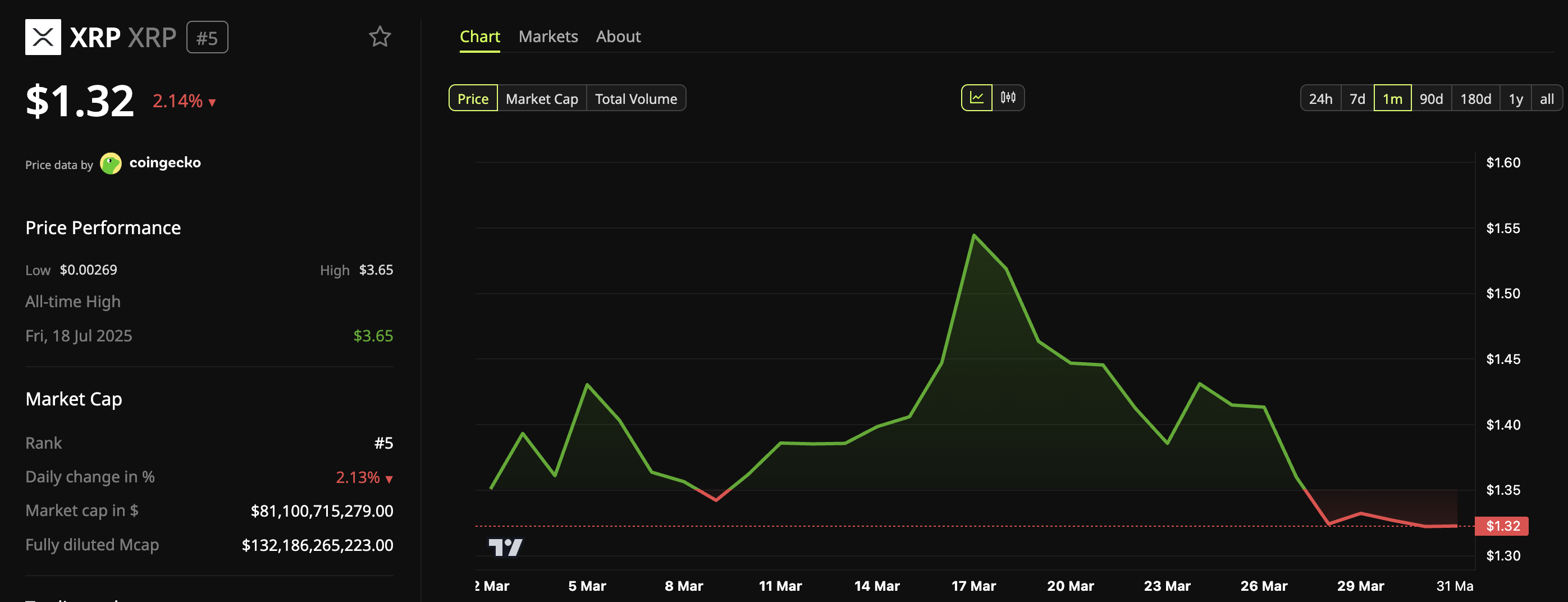 The fifth-largest cryptocurrency slipped more than 2% on the day, underperforming a broader market that edged 0.51% higher. At the time of writing, the altcoin traded at $1.32.