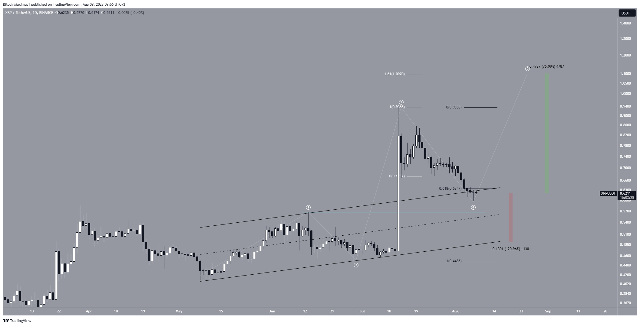 Although there is an optimistic prediction for the price of XRP, falling below the peak of wave one at $0.56 (red line) would suggest a shift toward a bearish trend.