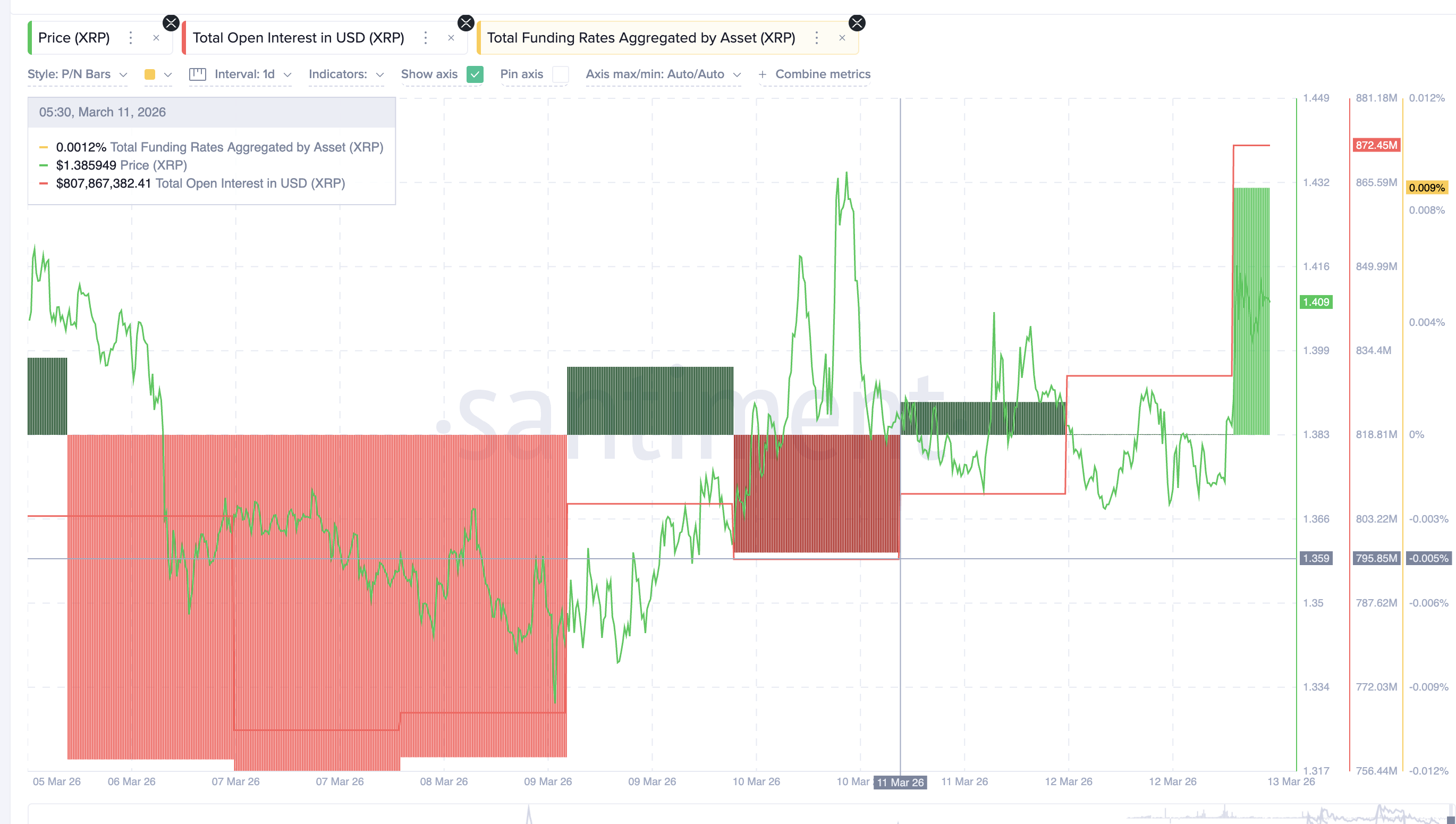 Open interest, which measures the total value of active futures contracts, has increased sharply in recent days. Between March 11 and March 13, open interest rose from about $795 million to $872 million, a roughly 10% increase.