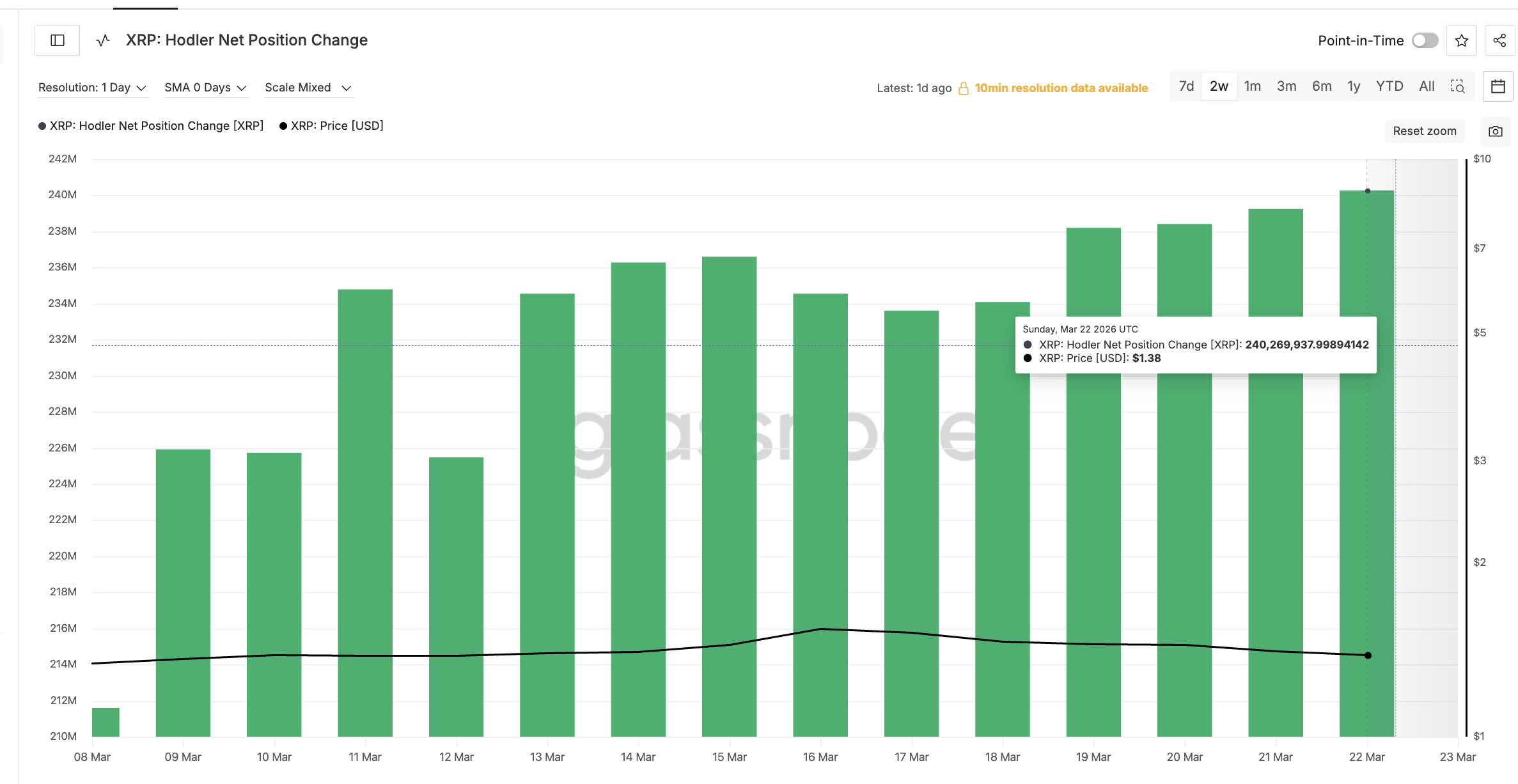 The hodler net position change, a Glassnode metric tracking accumulation or distribution by addresses holding for 155 days or more, paints a picture of steady conviction. On March 17, when the selloff began, hodlers held a net positive position of 233.6 million XRP. By March 22, that figure had climbed to 240.3 million XRP, a roughly 3% increase in five days despite a 15% price decline.