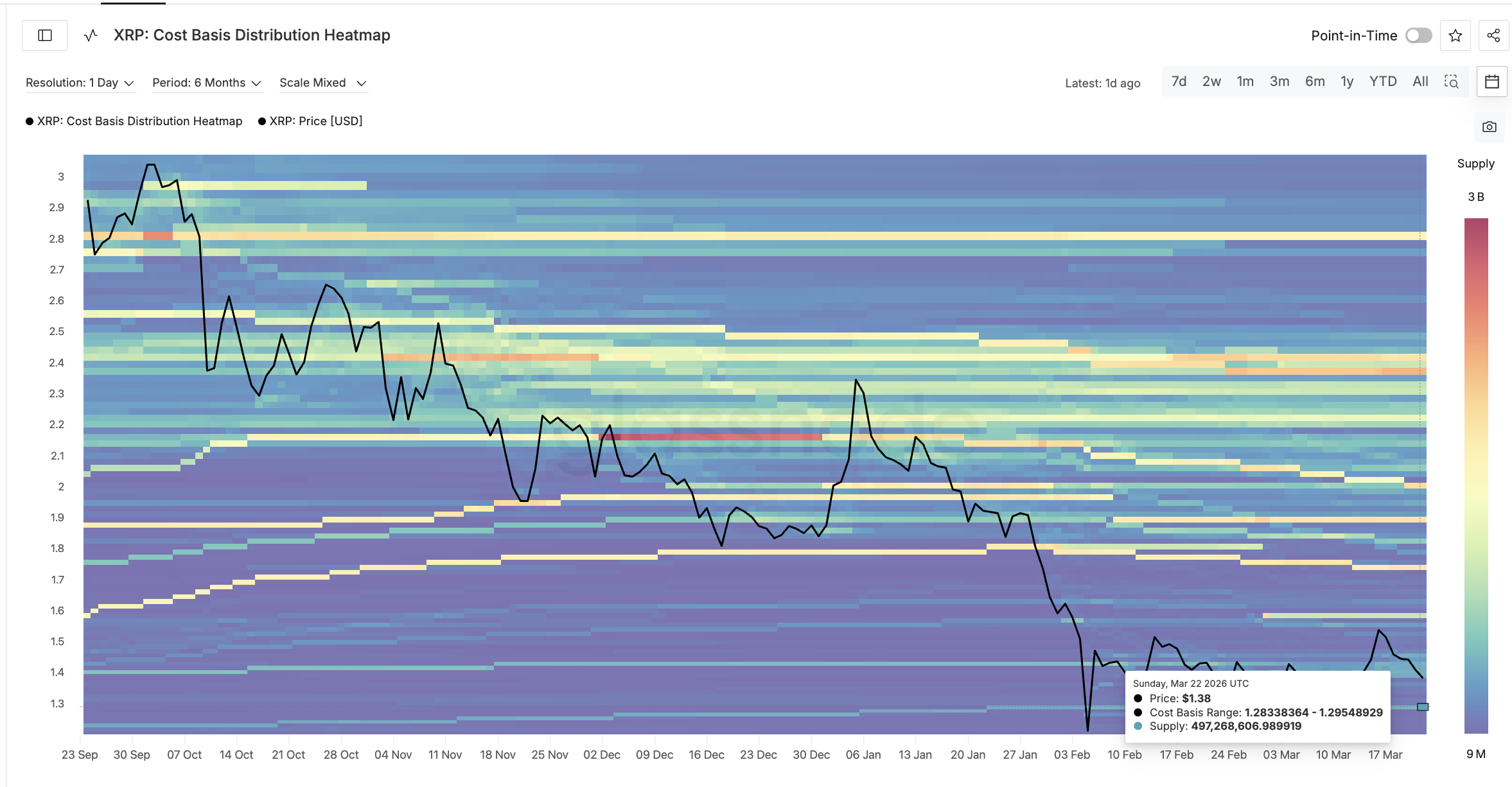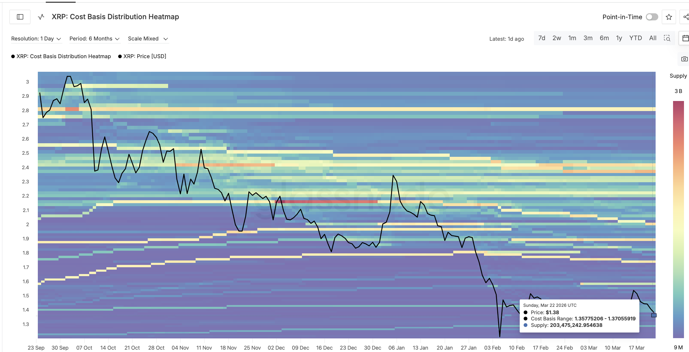 The cost basis distribution heatmap, a Glassnode metric that maps where holders last acquired their tokens, validates these technical floors. The $1.35 to $1.37 zone holds roughly 203 million XRP supply, creating a dense cluster of holders who have an incentive to defend their entry.