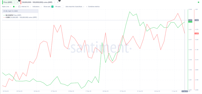 The Santiment chart below shows that crypto whales holding 10 million to 100 million XRP have added 30 million coins between March 24 and April 14.