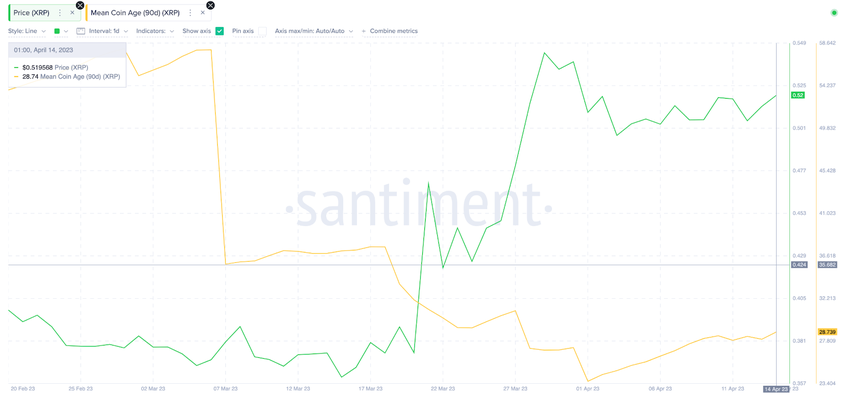 According to Santiment, Mean Coin Age on the XRP ledger network has entered an uptrend in recent weeks. After a network-wide sell-off in late March, the Mean Coin Age has been on the rise since April 1.