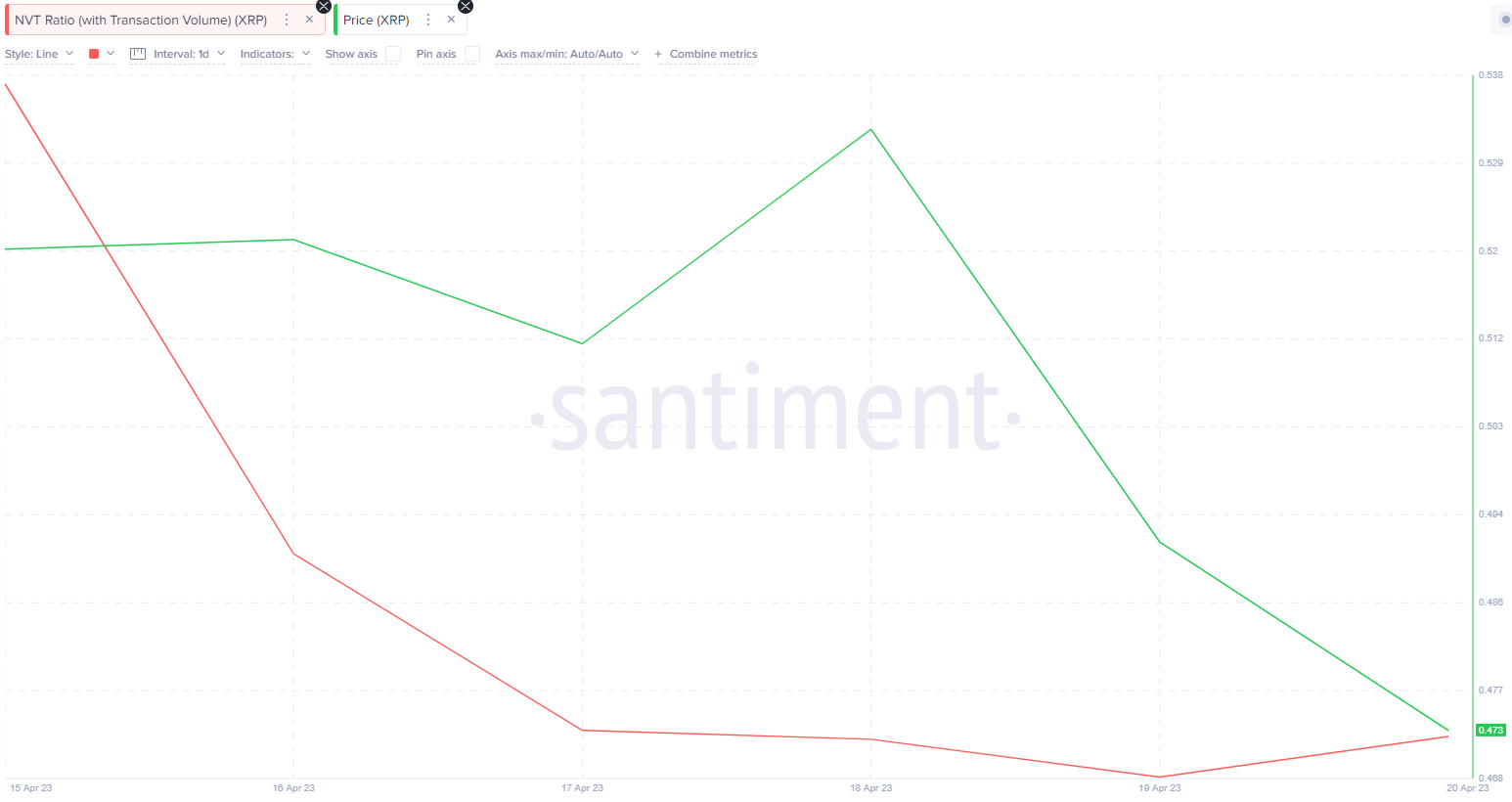 The red line in the chart below shows that the XRP NVT ratio has been trending downward since the start of the week. Between April 15 and April 21, it dropped 80% from 355.87 to 79.85.