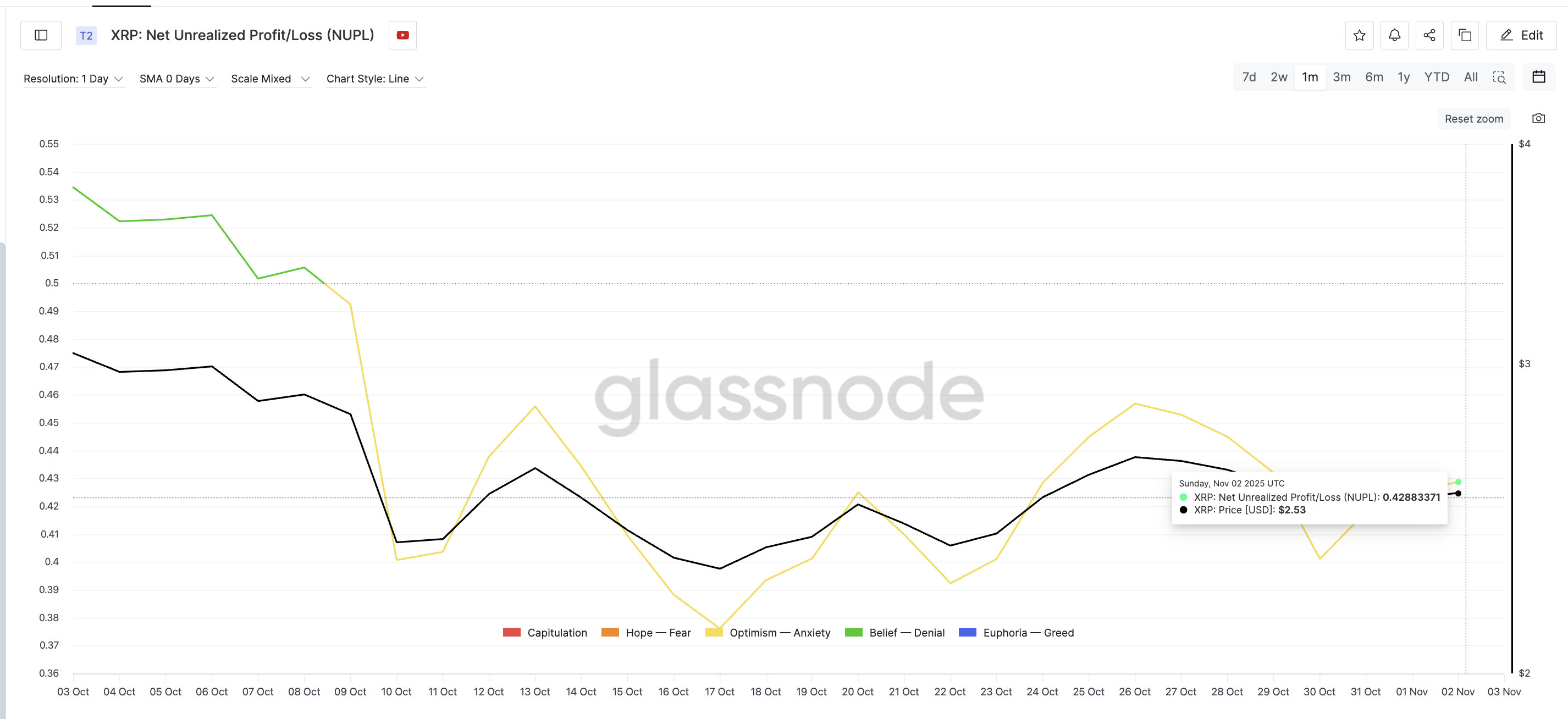 On-chain data supports this weakness. The Net Unrealized Profit/Loss (NUPL), which measures investor profit levels across the network, stands at 0.428, almost identical to the local peak of 0.425 reached on October 20. At that time, XRP dropped from $2.50 to $2.36, a 5.6% correction in just two days.