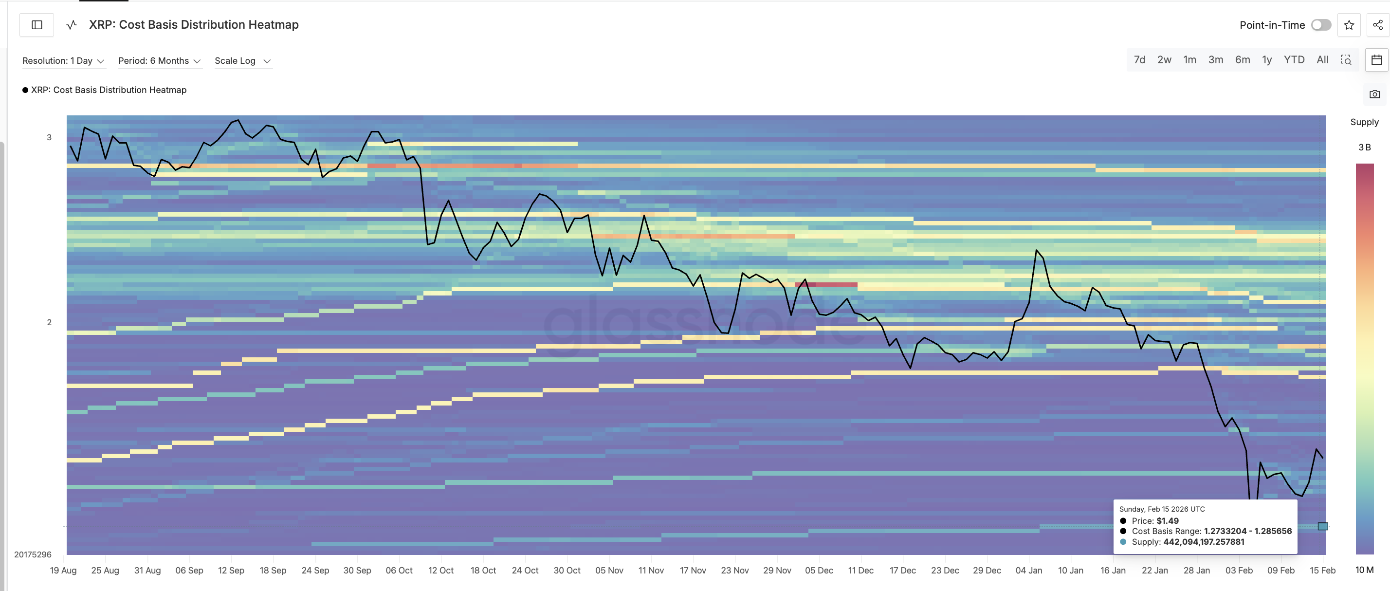 The most important level for XRP price now sits near $1.26. Cost basis data shows that more than 442 million XRP was accumulated between $1.27 and $1.28. Cost basis represents the price at which investors bought their coins. When the price returns to this level, holders often defend it to avoid losses.