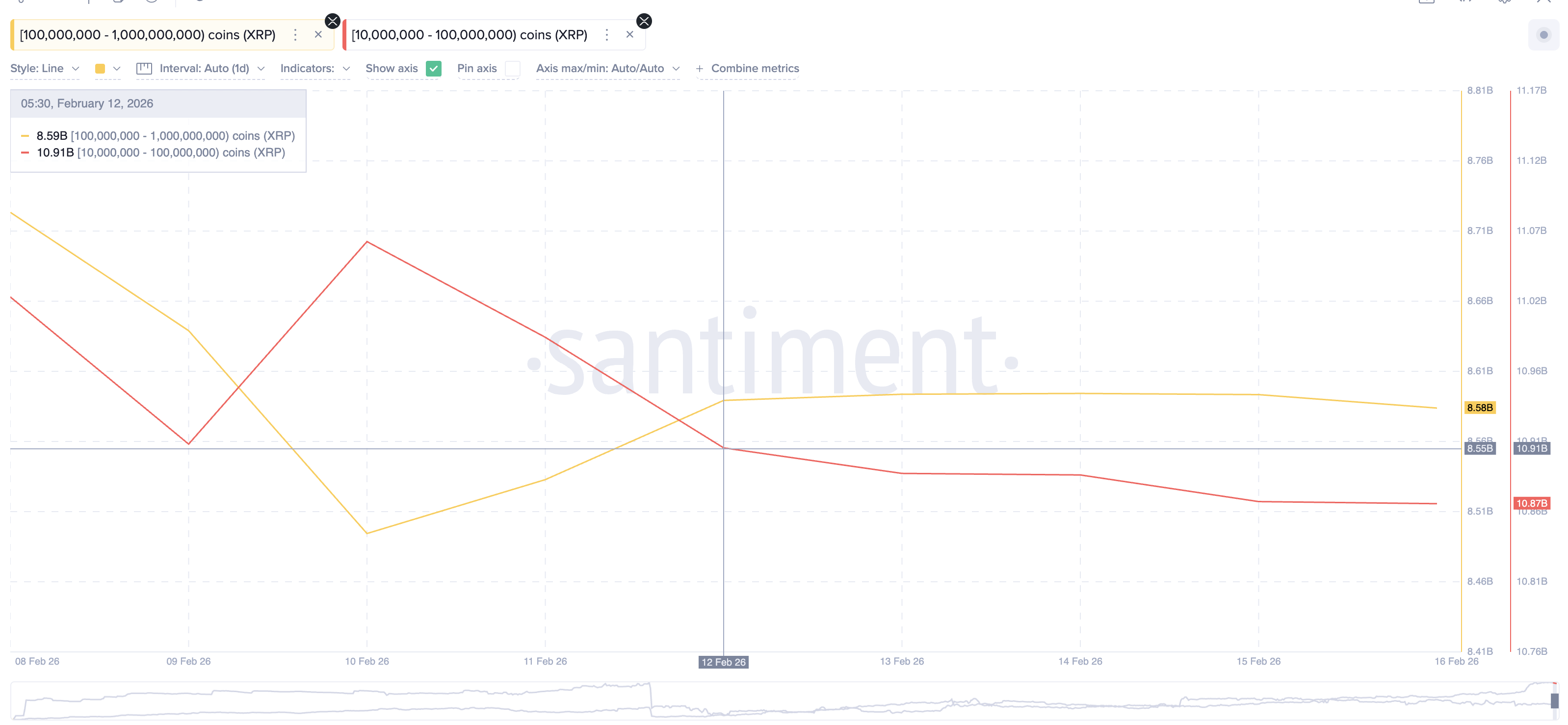 Smaller XRP whales holding between 10 million and 100 million XRP also sold heavily. Their holdings dropped from 10.91 billion (as of early February 12) to 10.87 billion XRP at press time. This represents another 40 million XRP, worth roughly $60 million, entering the market. Combined, XRP whales sold nearly 50 million XRP, worth about $75 million, during the recent rally attempt.