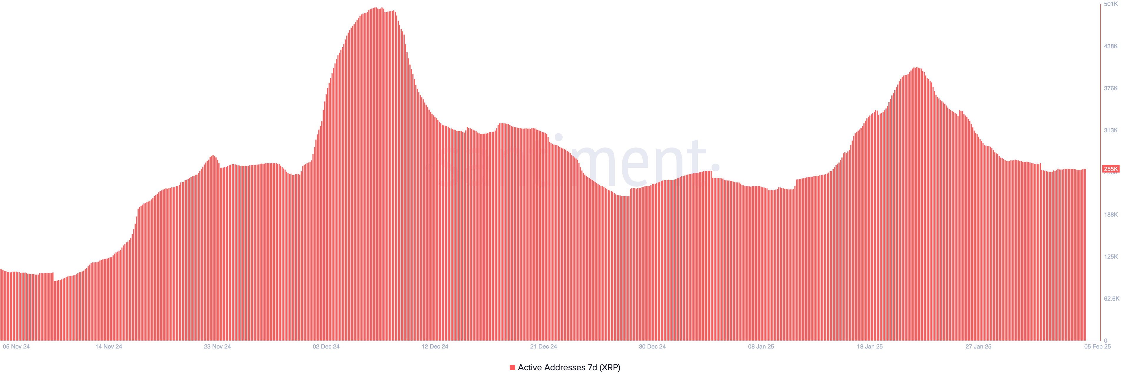 The number of 7-day XRP active addresses is currently around 256,000, down from 407,000 nearly two weeks ago, marking a 37% decline. While this remains a relatively high value compared to most of 2024, it is still nearly 50% lower than the peak reached in early December.
