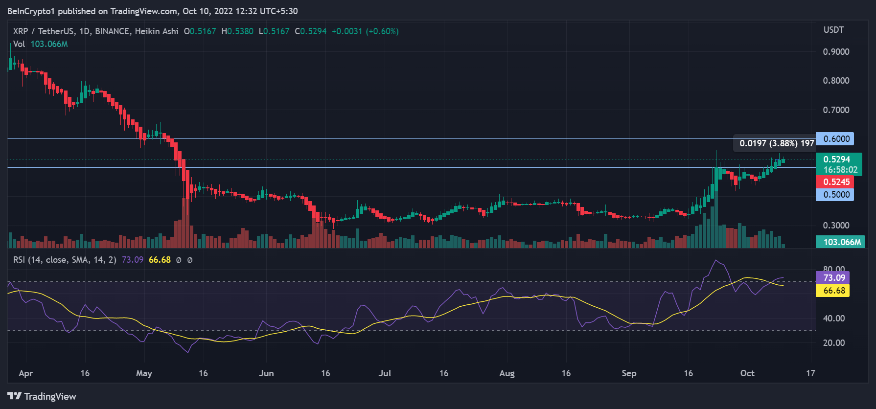 Sunday saw the XRP price rise by 3.8% to an intraday high of $0.540, as the sixth-largest cryptocurrency by market cap witnessed higher social volumes. At press time, Ripple XRP price was trading at $0.534, up 4.23% on the daily chart.