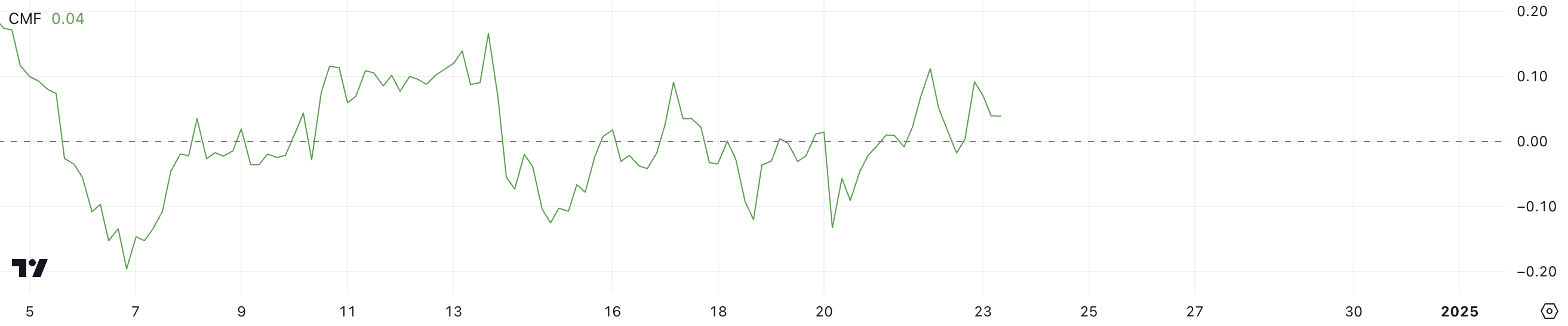 CMF is an indicator used to assess the strength of buying or selling pressure by analyzing both price and volume over a specific period. It ranges between -1 and +1, with positive values indicating net buying pressure and negative values reflecting net selling pressure. A CMF above 0 typically suggests that more money is flowing into the asset, indicating accumulation, while a CMF below 0 suggests distribution.