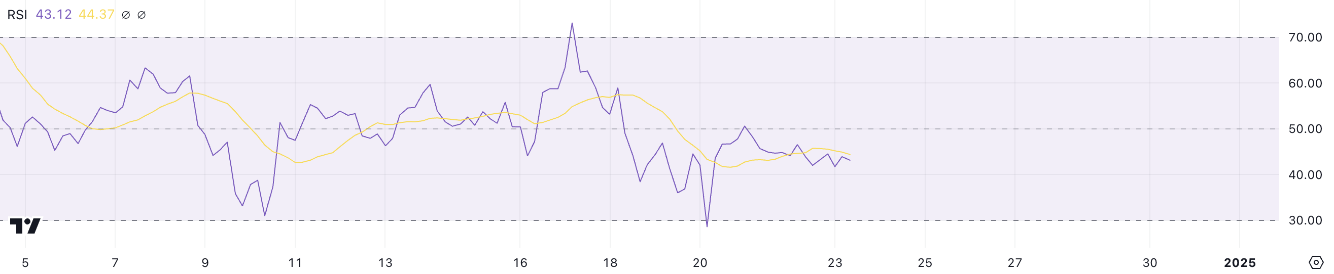 Conversely, readings above 70 suggest an overbought condition, where prices may have risen excessively and could face downward pressure. XRP RSI at 43.12 places it within a neutral range, neither oversold nor overbought.