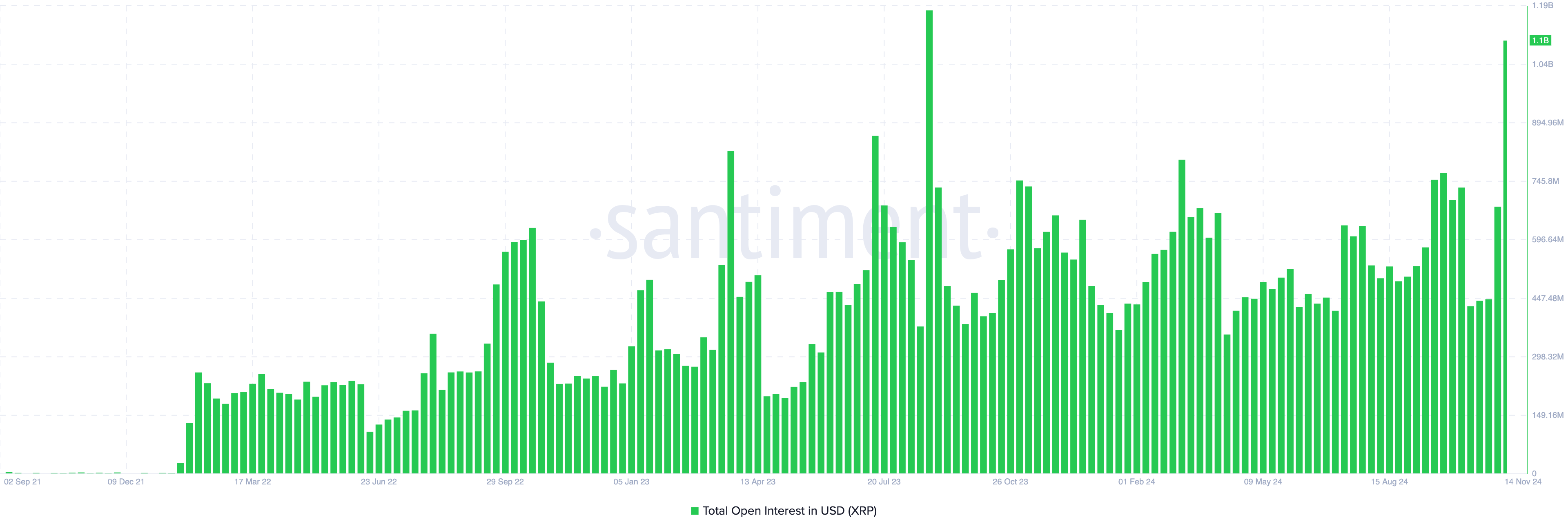 From an on-chain perspective, the increase in Open Interest (OI) appears to have been a significant driver of XRP’s momentum. Data from Santiment shows that XRP’s OI surpassed $1 billion for the first time since August 2023 — at that time it happened due to Ripple’s partial victory over the US SEC, highlighting heightened speculative activity around the token.