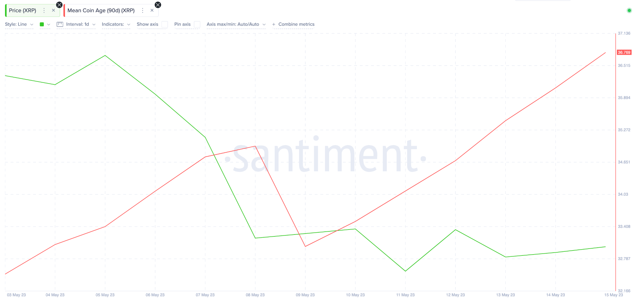 Since May 9, Mean Coin Age across the Ripple network has increased on seven consecutive days. Notably, between May 9 and May 15, the XRP Mean Coin Age surged 11% from 33.03 to 36.77.