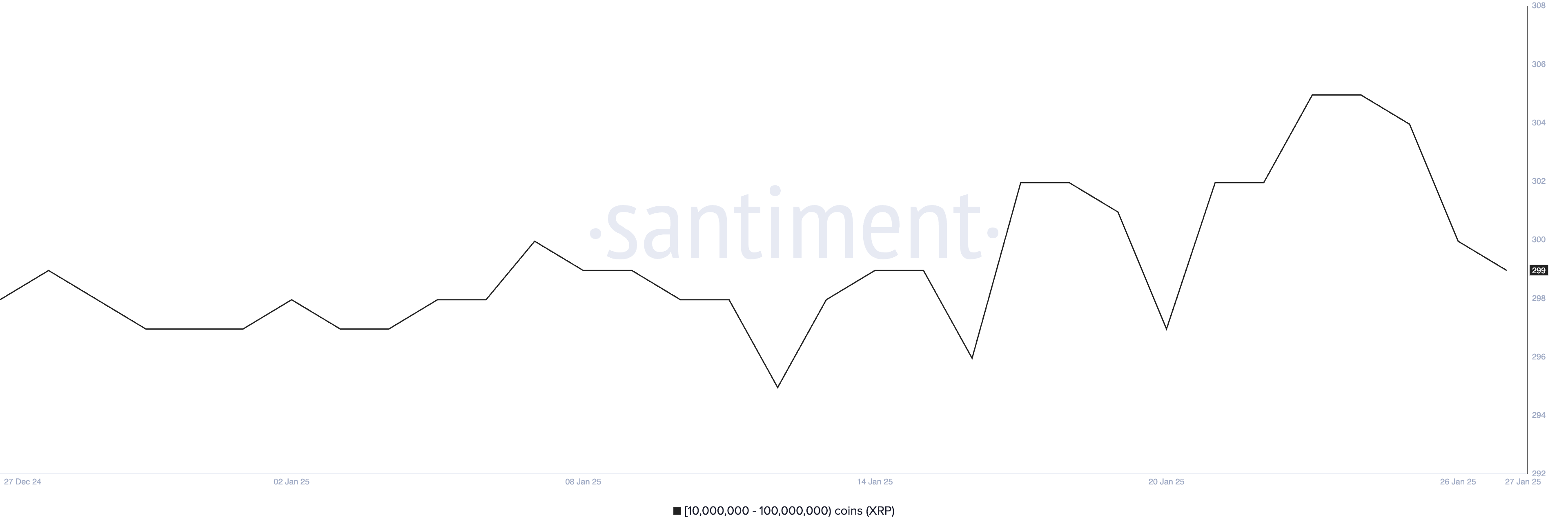 XRP whale addresses—those holding between 10 million and 100 million XRP—reached 305 on January 23 and 24, marking one of the highest levels ever recorded.