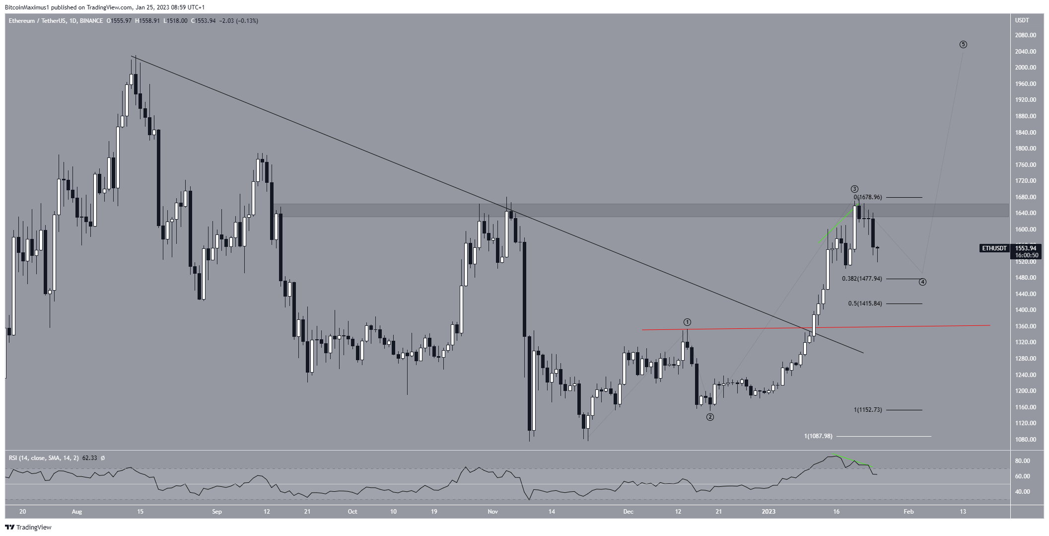 The ETH price is likely in wave four of a five-wave upward movement. So, the current correction could end near the 0.382-0.5 Fib retracement support levels at $1,488-$1,416. Afterward, wave five would be expected to take the Ethereum price above the Aug. 2022 high at $2,030.