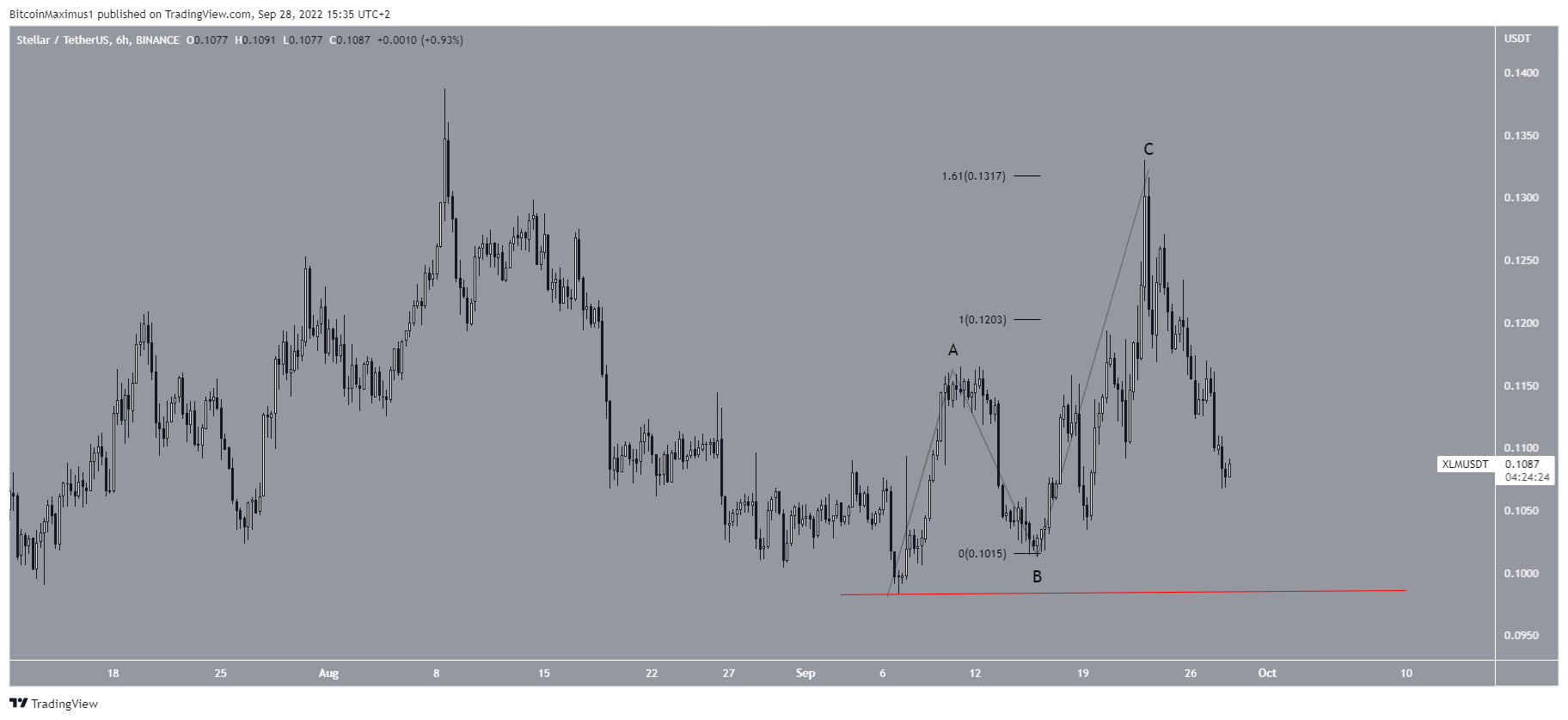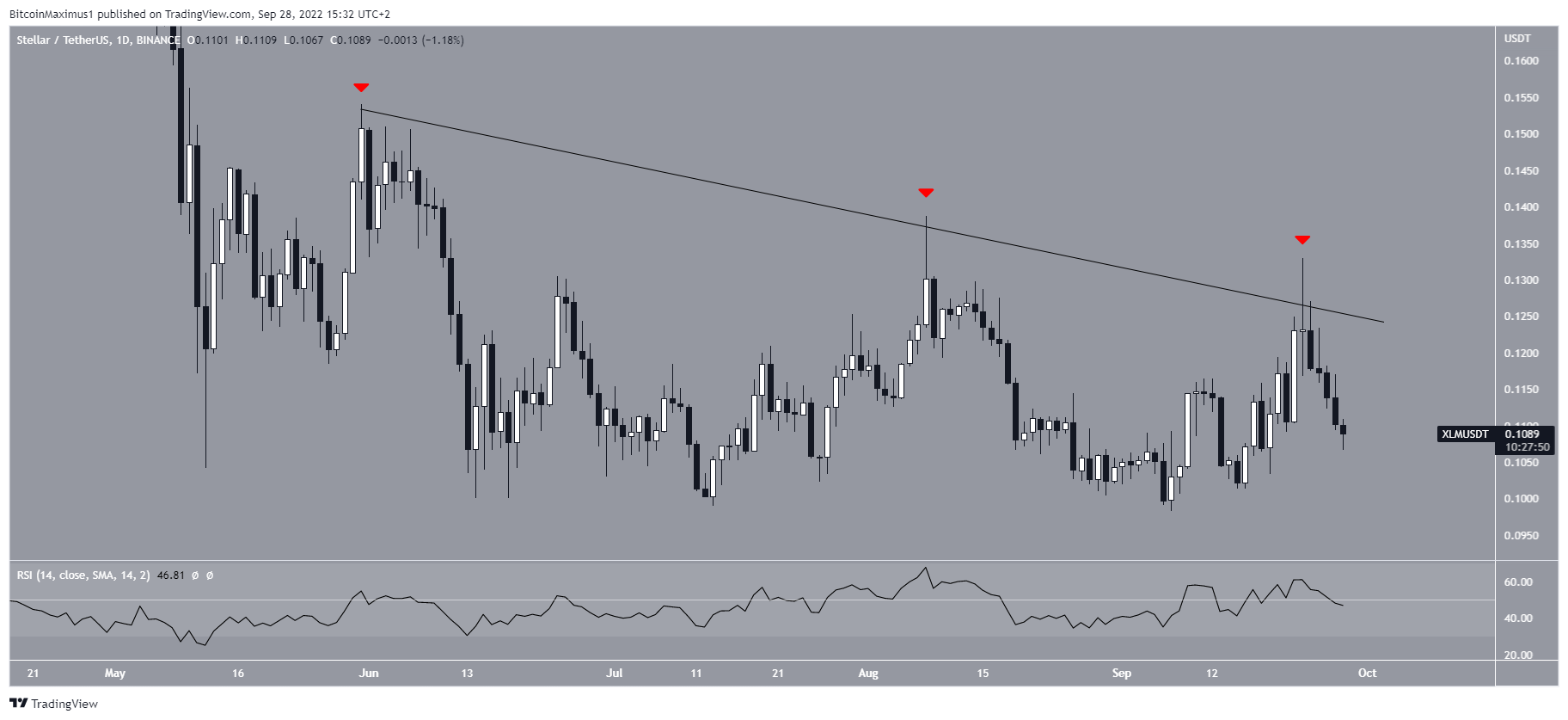 The price movement for XLM is more bearish than that of XRP. The price has been decreasing underneath a descending resistance line since the beginning of June. More recently, the line caused a rejection on Sept. 23 (red icon).