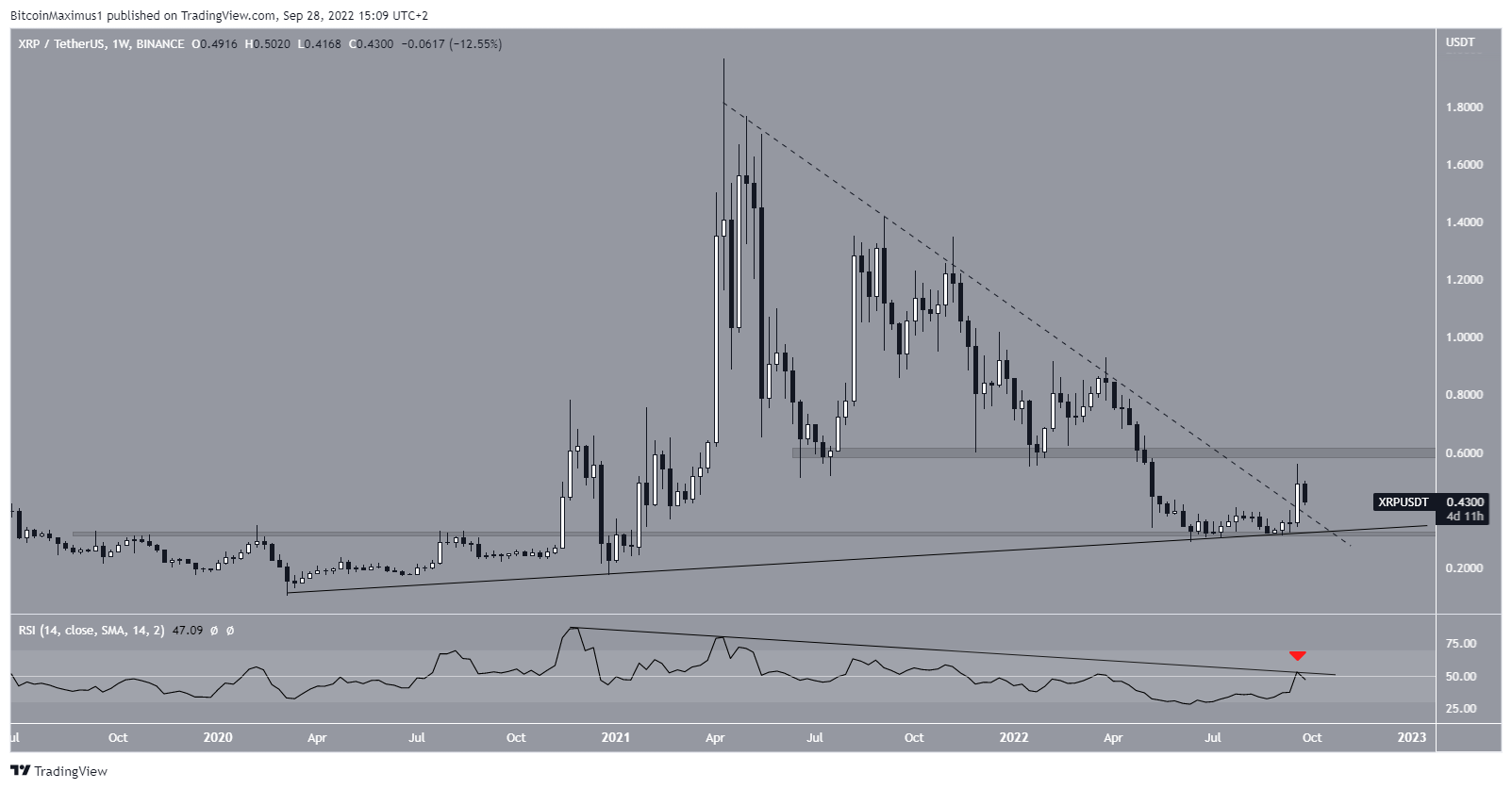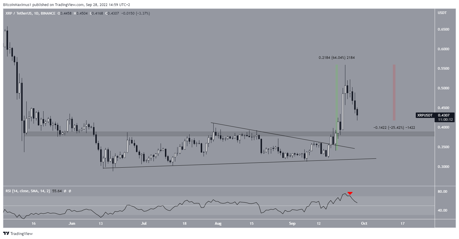 SponsoredOn Sept. 17, XRP broke out from a descending triangle pattern that had been in place since June 14. The breakout led to a high of $0.559 six days later, an increase of 64%. It is possible that the increase was fueled by speculation about a positive settlement in the ongoing Ripple vs SEC case.