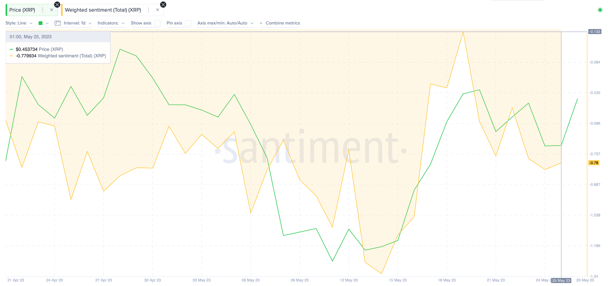 After approaching the neutral area on May 19, XRP Weighted Sentiment has recently dropped deeper into the negative zone toward -0.8 as of May 26.