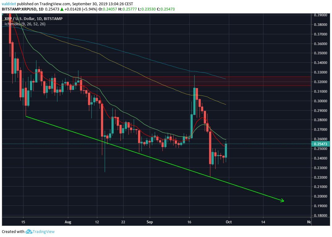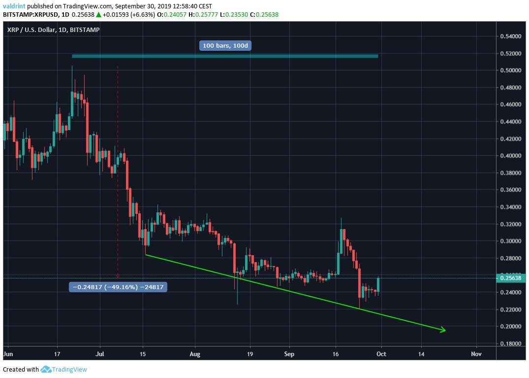 While the increase looks very significant looking at this time-frame, the XRP price has been embroiled in a downtrend for the past 100 days. During this time, it has lost roughly 50 percent of its value.