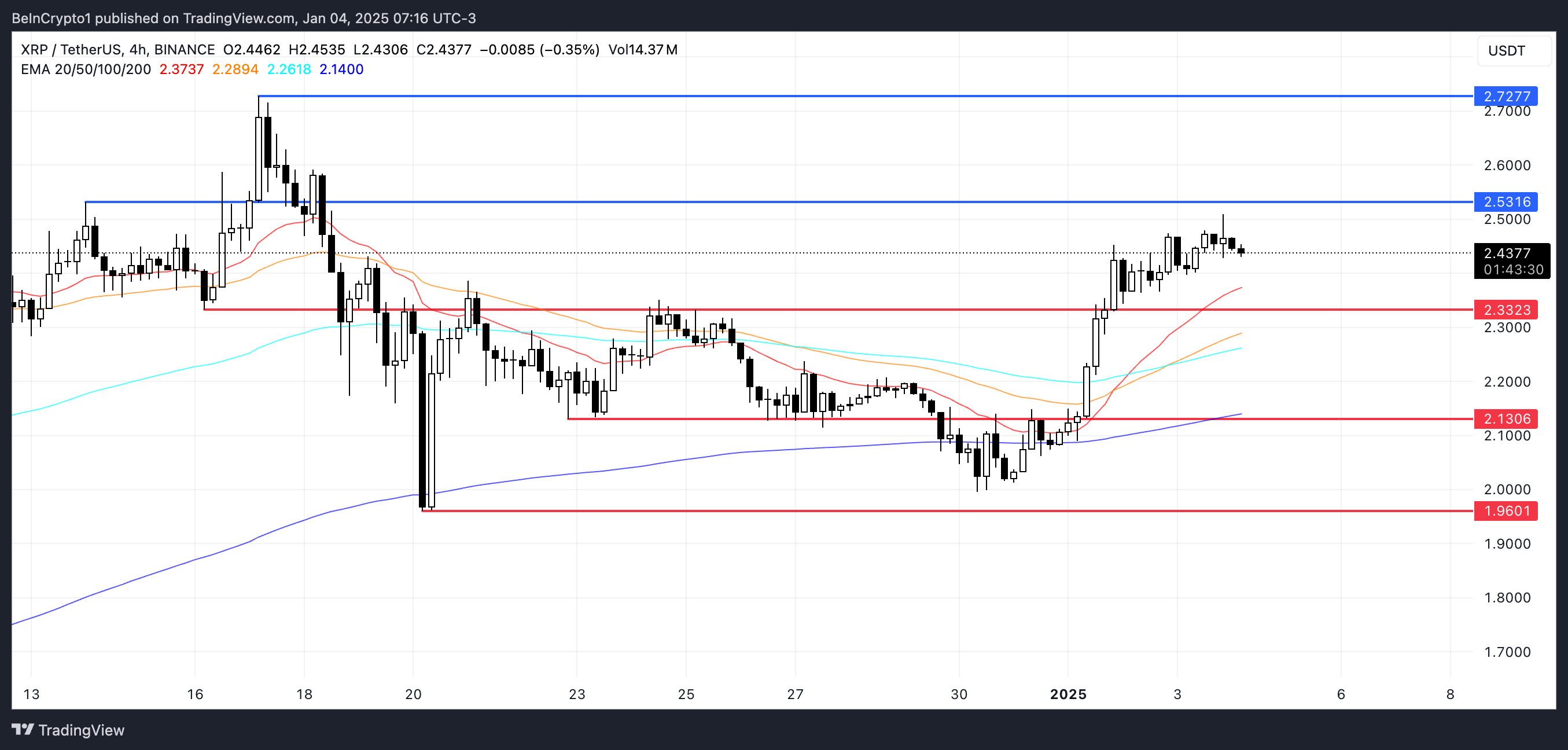 XRP price is currently trading in a tight range, between $2.53 resistance and $2.33 support. The formation of a golden cross on January 1 fueled the recent price surge, signaling strong bullish momentum.