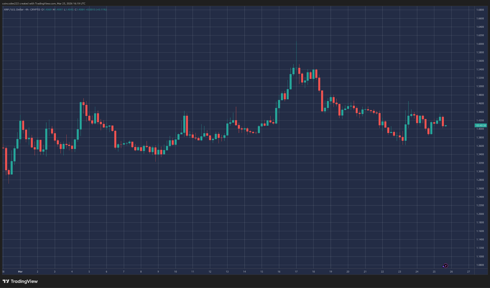 Since the conflict began on February 28, XRP has traded in a range between $1.32 and $1.60, spending most of its time between $1.35 and $1.45. The price action has been quite choppy, with no clear trend formation.