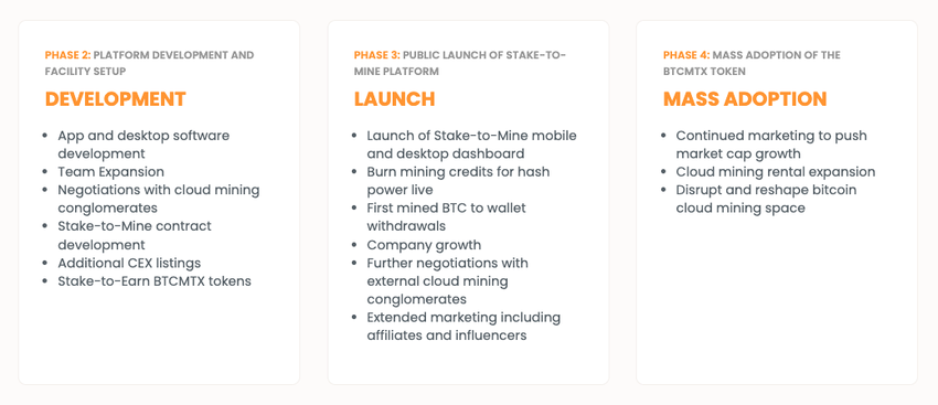 It works through a decentralized Stake-to-Mine model that lets users gain hash power by staking their BTCMTX tokens.